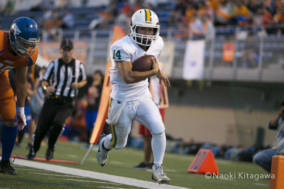 スクランブルで18ヤードTDランを決めた、専修大の1年生QB #14坪沼(撮影:北川直樹)