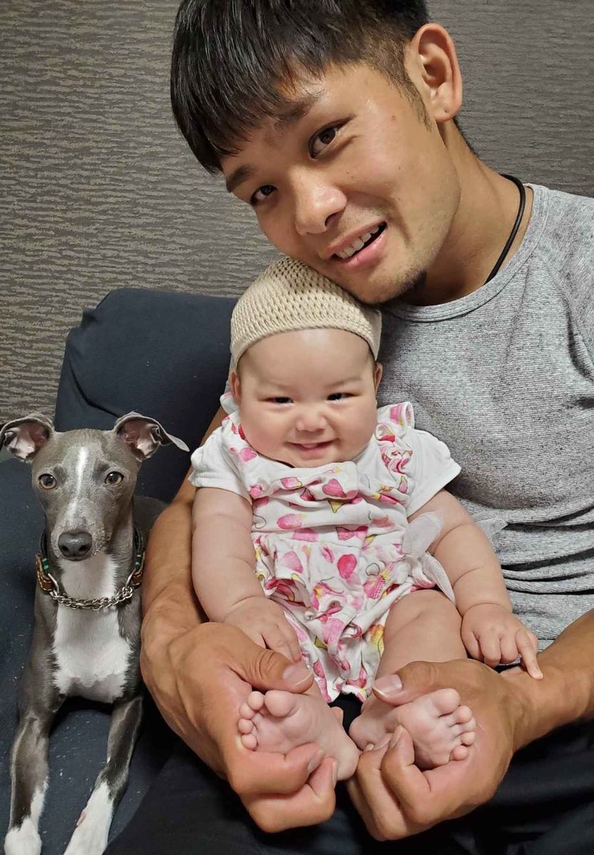 1月に誕生した希架(まれか)ちゃんを抱く別府。お嬢ちゃんは夫人似か⁉
