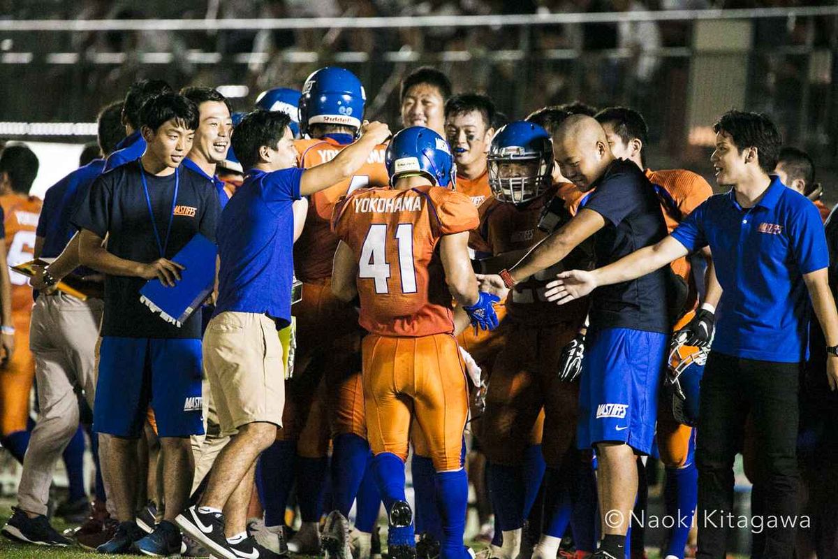 タッチダウンを奪い、サイドラインで祝福される横国大RB#41信原健人(撮影:北川直樹)