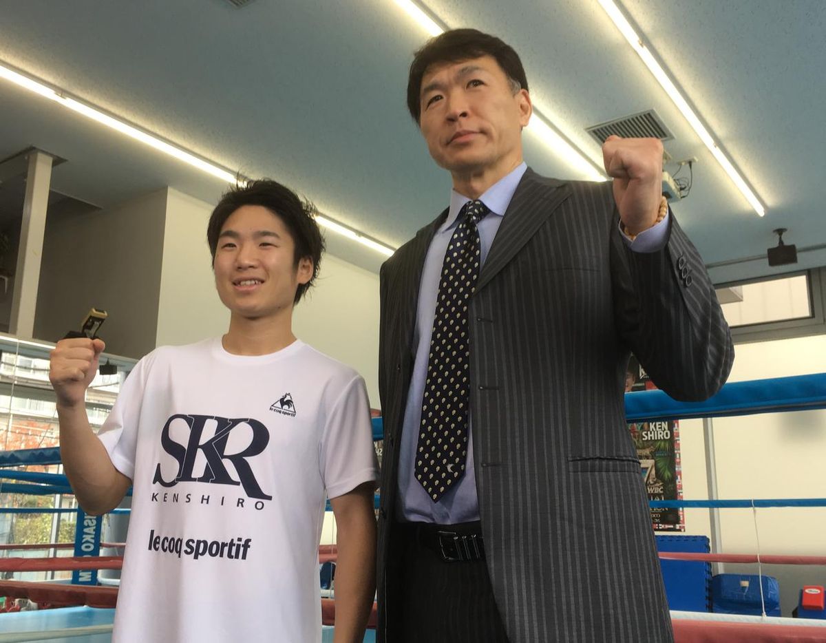 写真上=父の寺地永会長と勝利を誓う王者・拳四朗