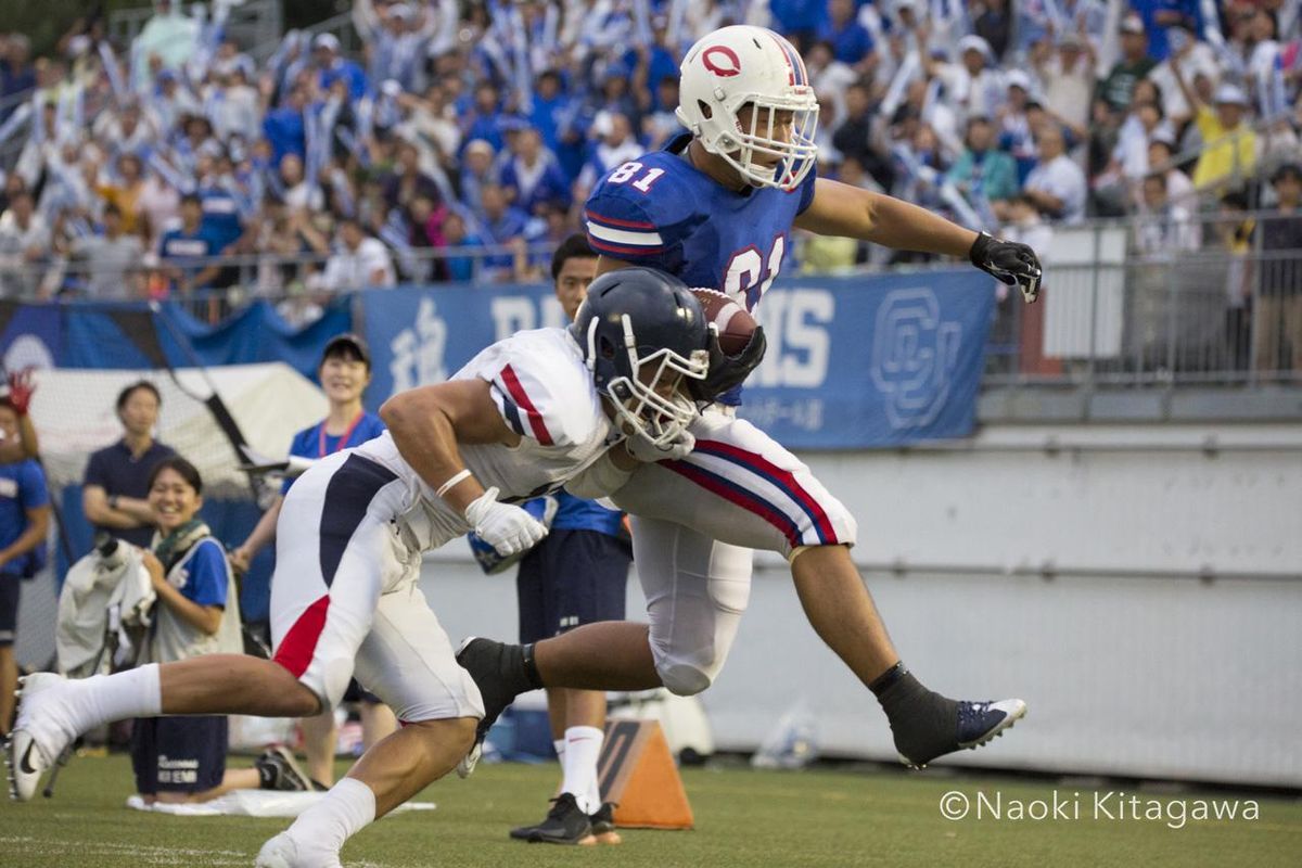 第4Qに同点に追いつくタッチダウンパスをレシーブした、中央大WR#81島津雅幸(撮影:北川直樹)