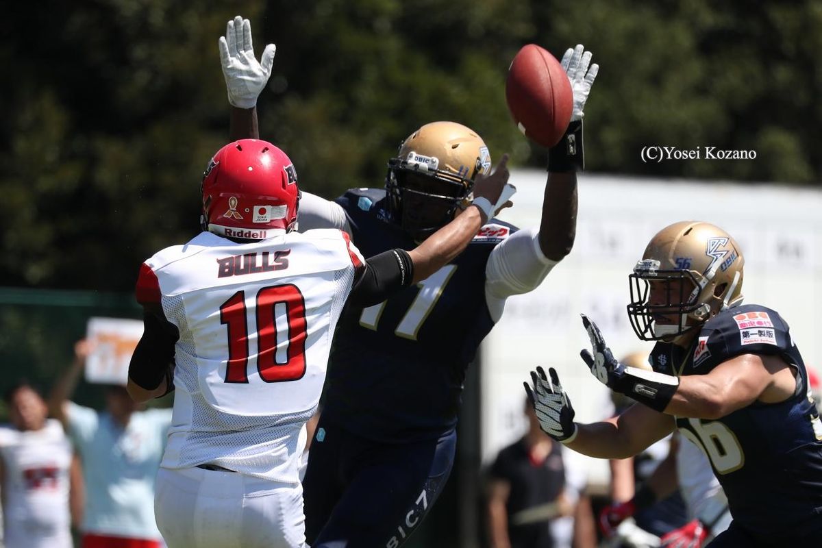 【オービック vs BULLS】オービックDEのケビン・ジャクソンがBULLSのQB時崎のパスを叩く=2018年8月26日、撮影 Yosei Kozano