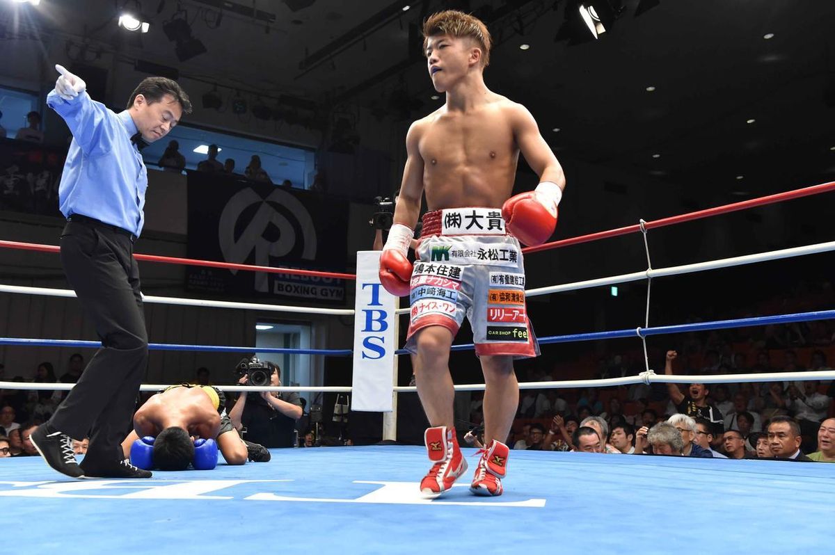 まだ4回戦の新人がなかなか打てるような左アッパーではない。初回途中に一度顔を跳ね上げ、タイミングをつかんでいたのだろう。塚田が出てきたラウンド終了間際、その入り際をものの見事に捉え、ガクリとヒザを着かせた。相手の攻めはダッキングやブロッキングでしっかりかわすなど、試合運びは実に冷静。2回のフィニッシュもロープ際で迎え撃ち、この試合、3発目の左アッパーを決める。ゆっくりと塚田が崩れ落ちるのと同時、レフェリーがストップした。