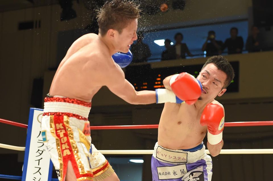 5回には右のカウンターで春口をバッタリと前のめりに倒したが、立ち上がった挑戦者も必死に打ち返してここはしのいだ。