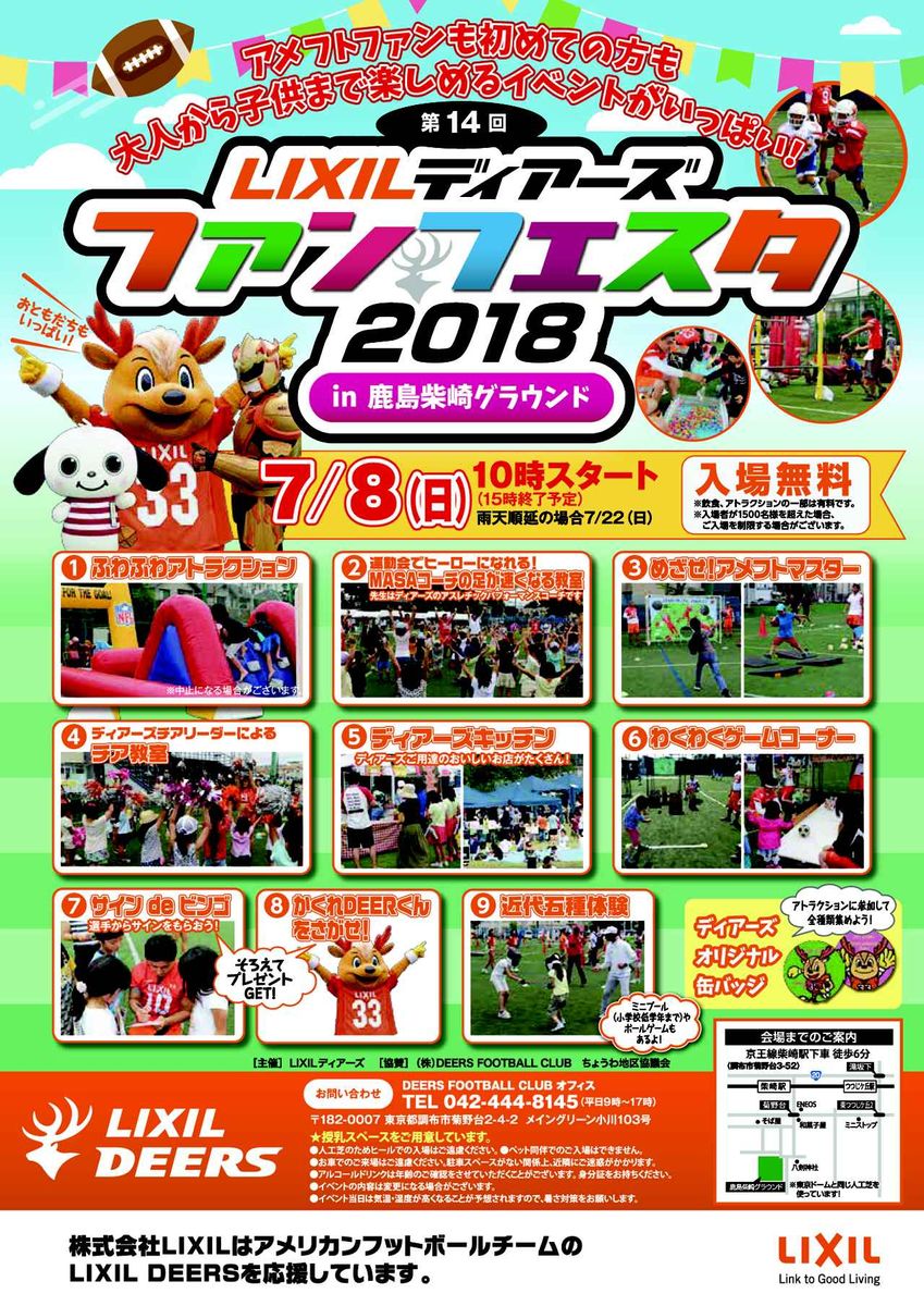 社会人アメリカンフットボール・XリーグのLIXILディアーズが、7月8日(日)に「ディアーズファンフェスタ2018」=東京都調布市のディアーズ柴崎グラウンド=を開催する。