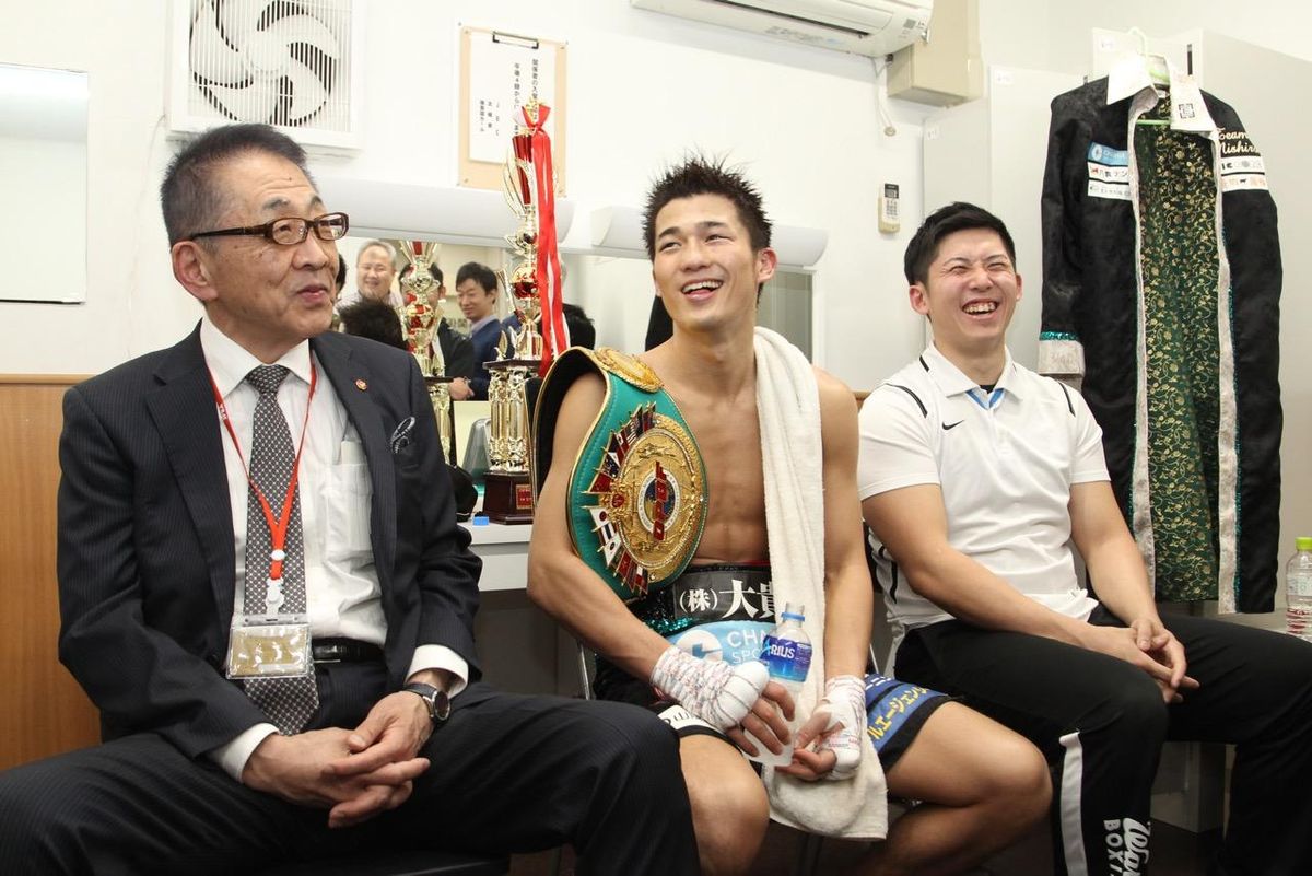 渡辺均会長(左)、中根トレーナーと喜びを分かちあ会う三代