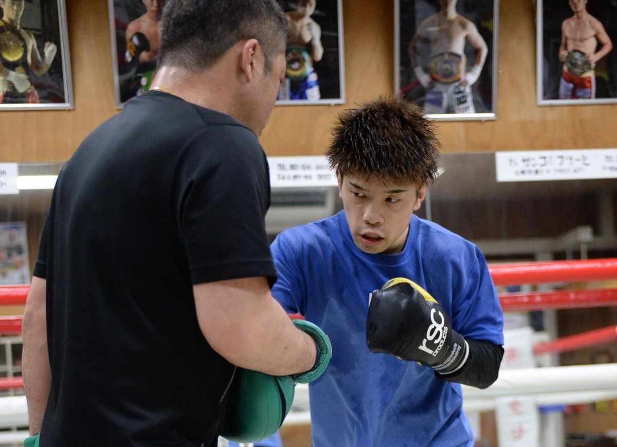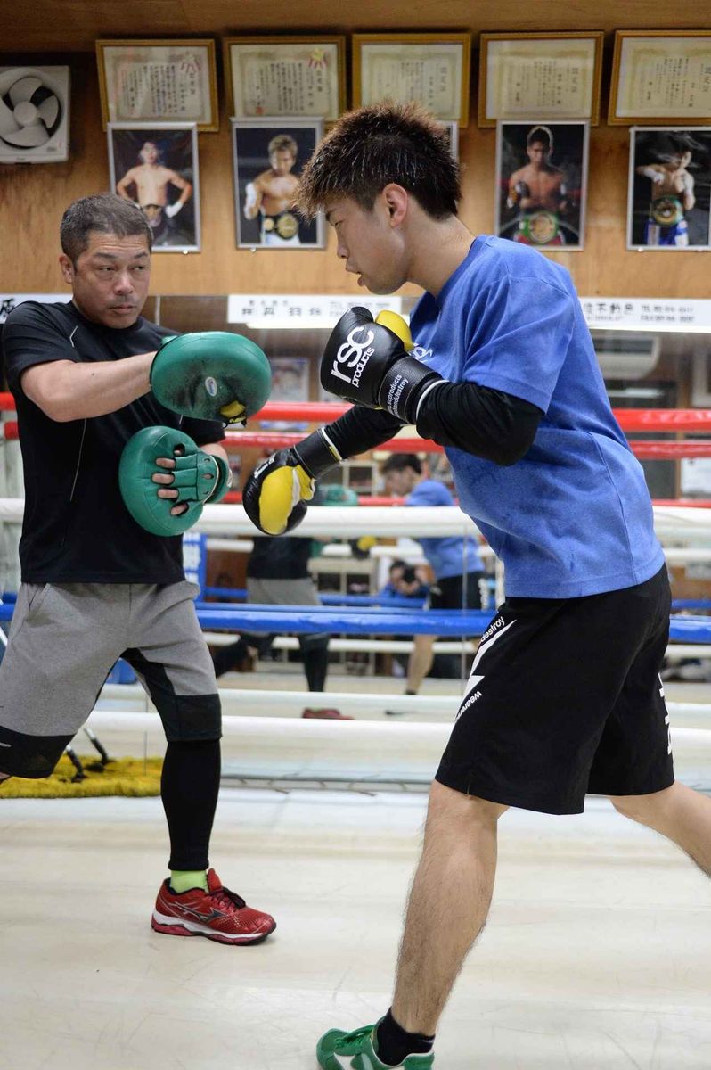 上写真=スピーディーでヘビーな右をズドンと打ち込む田中恒成。父・斉トレーナーが必死に痛みをこらえるほどだ
