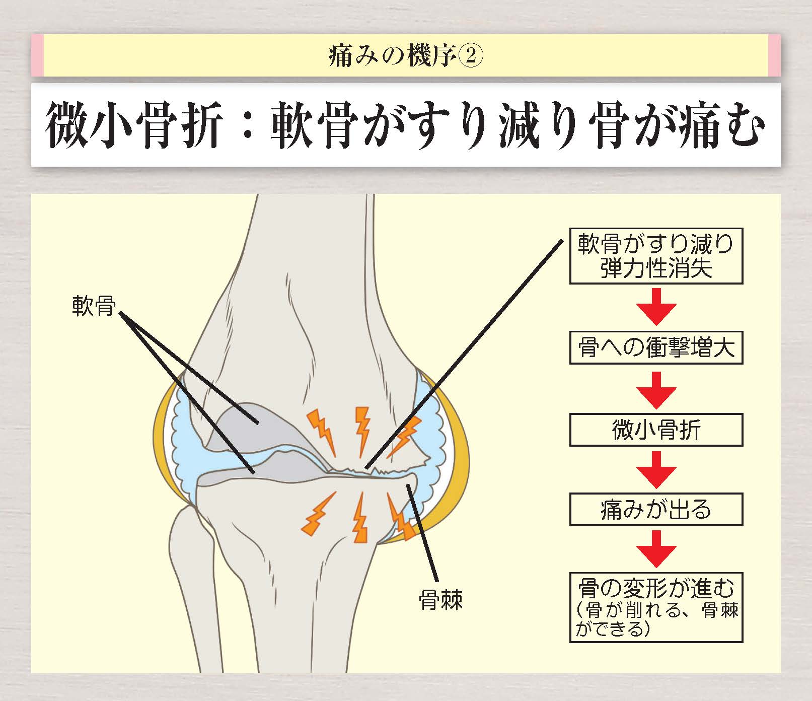 軟骨がすり減り弾力性が失われると、軟骨の下にある骨への衝撃が増えてきます。歩くたびに大腿骨と脛骨に衝撃がかかれば、やがて骨に微小骨折が起こります。骨には神経があるため、微小骨折によって痛みを感じます。