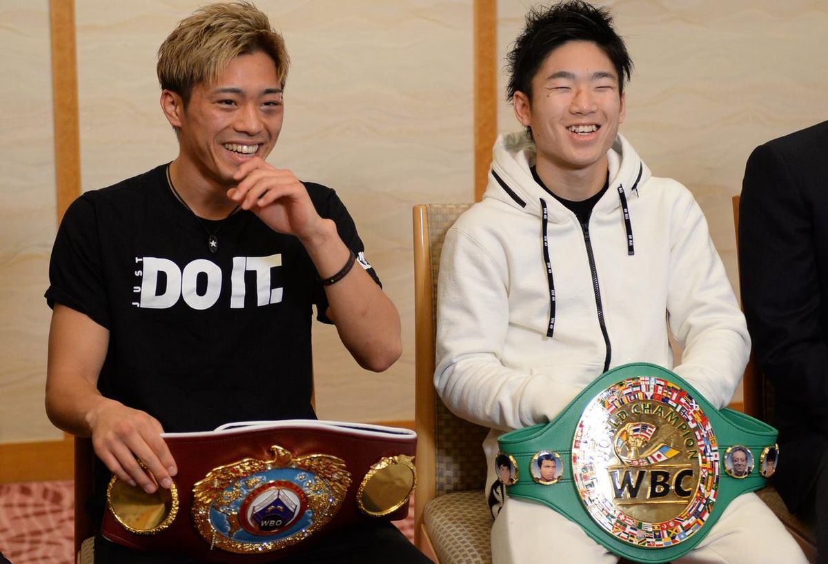 30日、東京・大田区総合体育館で初防衛に成功したWBO世界スーパーフェザー級チャンピオン伊藤雅雪(27歳=伴流)と、5度目の防衛に成功したWBC世界ライトフライ級チャンピオン拳四朗(26歳=BMB)が、31日、東京都内でそろって一夜明け会見。両陣営ともに喜びをともにした。