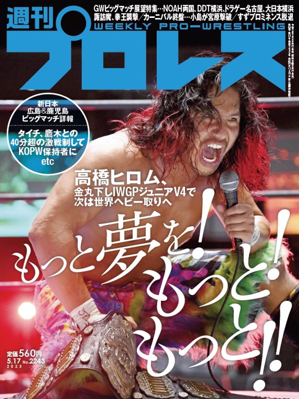 毎週水曜発売(一部地域はことなります)の週刊プロレスの内容、見どころを発売1日前の火曜に紹介します。今週号の表紙は新日本の広島大会で金丸義信を下し、IWGPジュニアV4に成功した高橋ヒロムです。5・3福岡ではヘビー級王座挑戦が決まっているヒロムが、ジュニア王者のままヘビー級王者になる夢へ向けて前進。広島大会だけでなくKOPW戦で鷹木との大激戦を制して約1年振りにタイチが保持者となった鹿児島大会とあわせて巻頭からリポート。