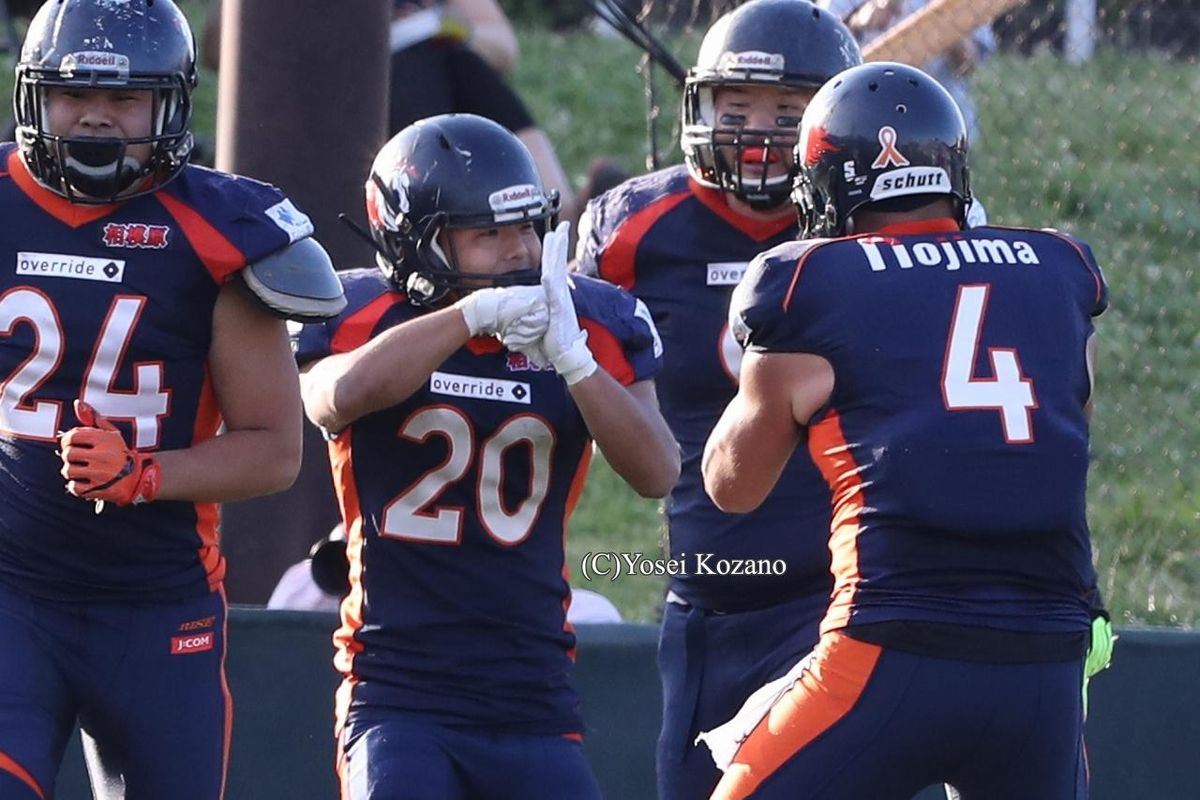 【ノジマ相模原 vs アサヒビール】第1クオーター、ノジマ相模原RB前島(20)がパントリターンTDを決め、チームメートに祝福される=撮影:Yosei Kozano