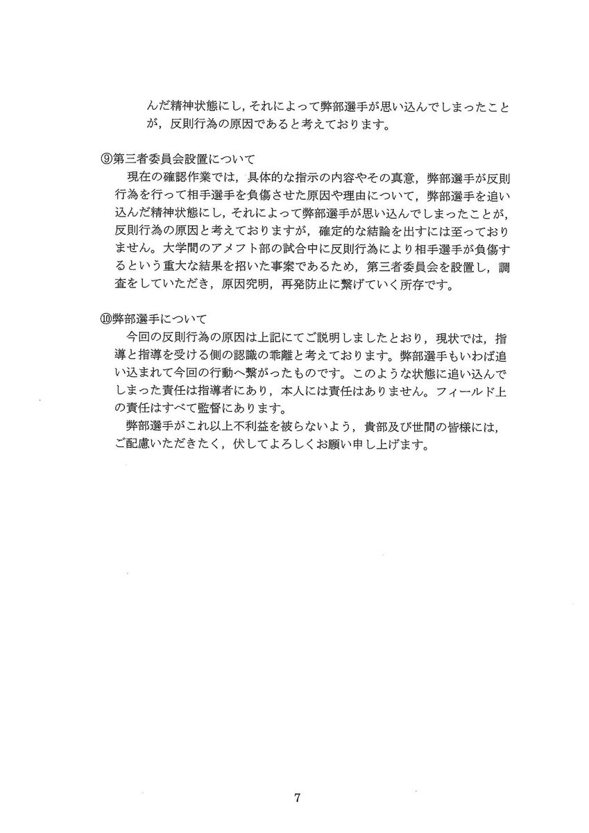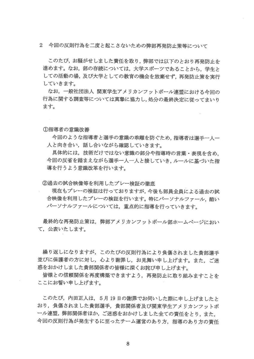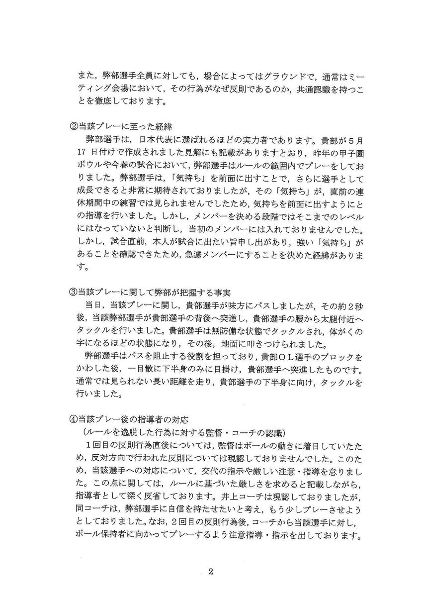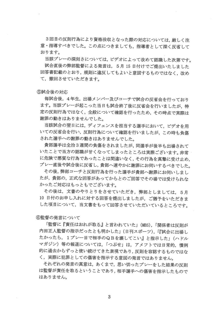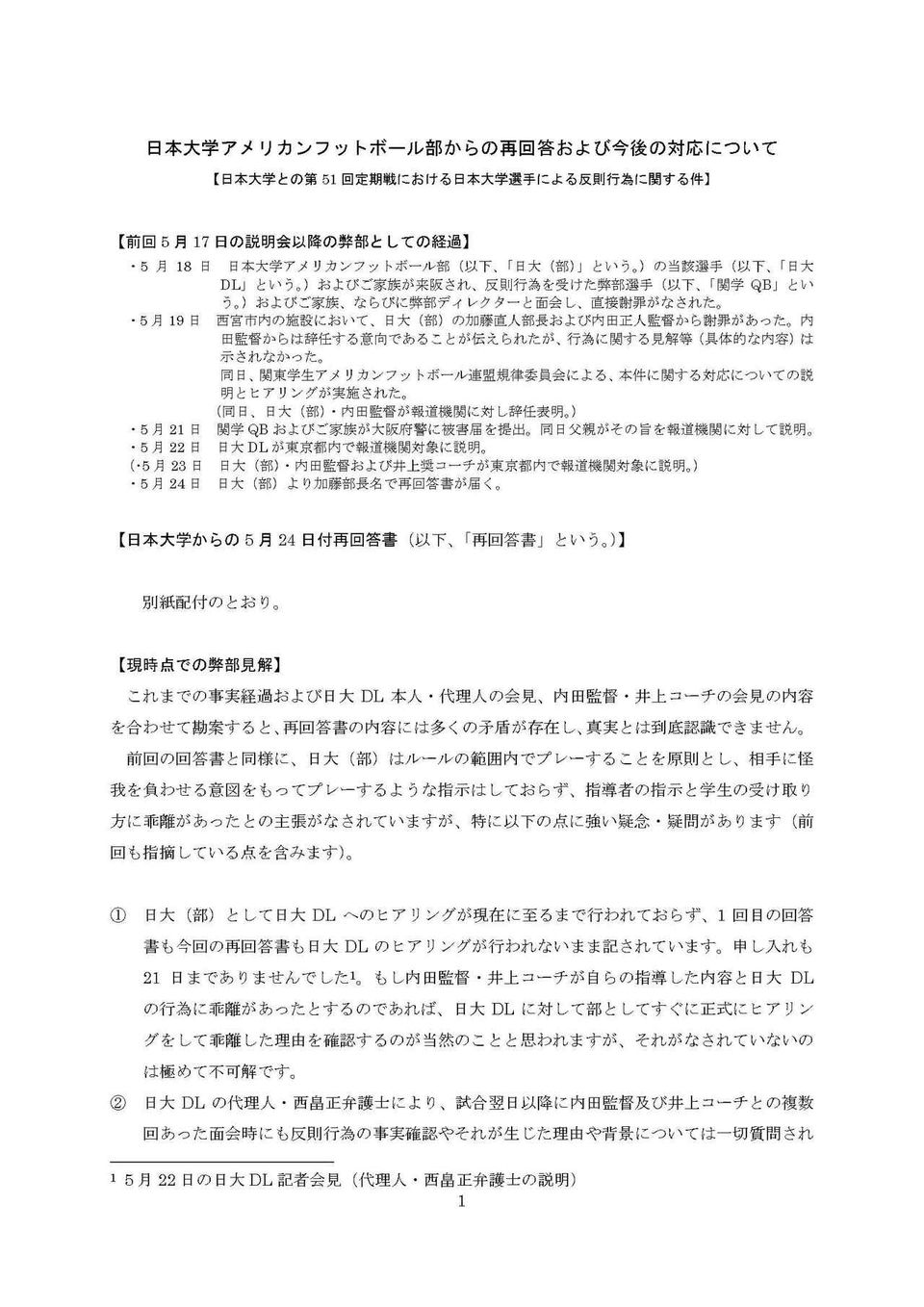 日大からの再回答書が配付され、「日本大学アメリカンフットボール部からの再回答および今後の対応について」という文書を小野宏ディレクターが読み上げた。関学大アメリカンフットボール部としての今後の方針は以下のとおり。