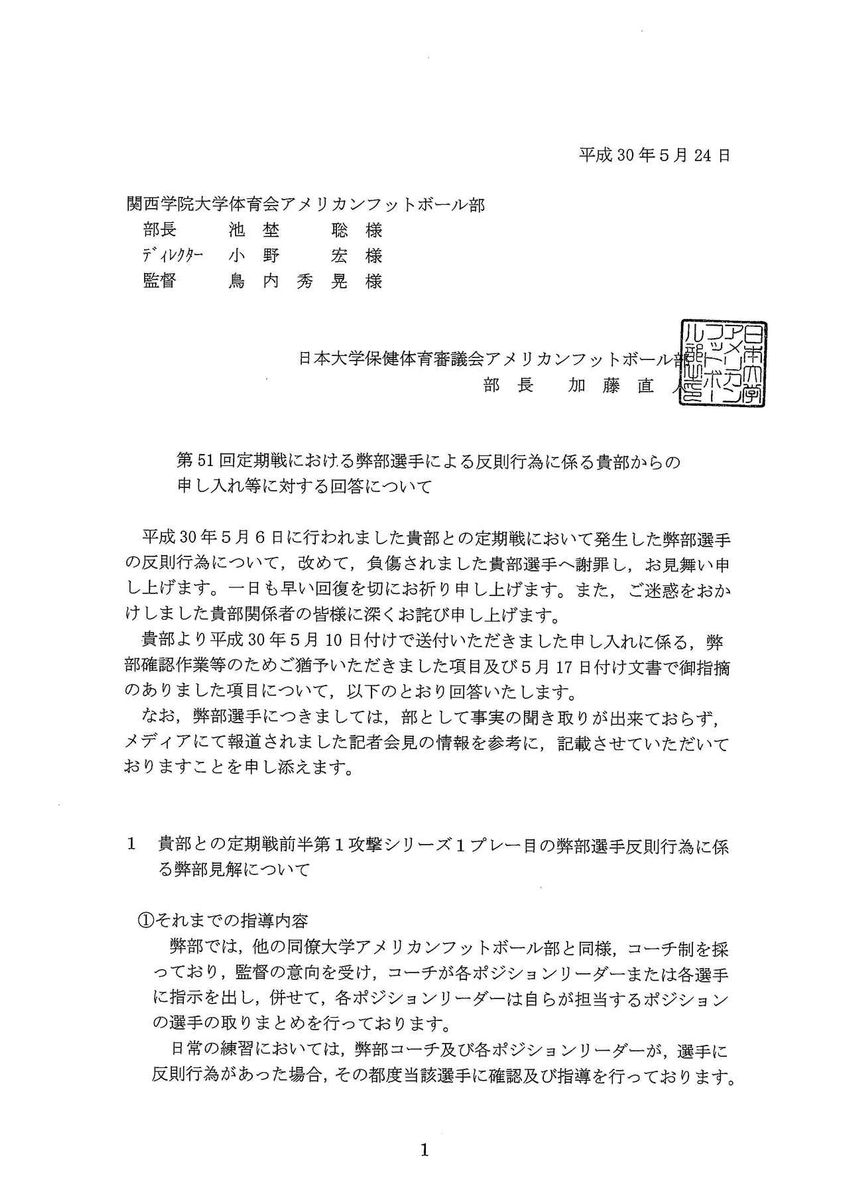 関学大の「今後の対応について」の文書と日大からの回答書は以下の通り。