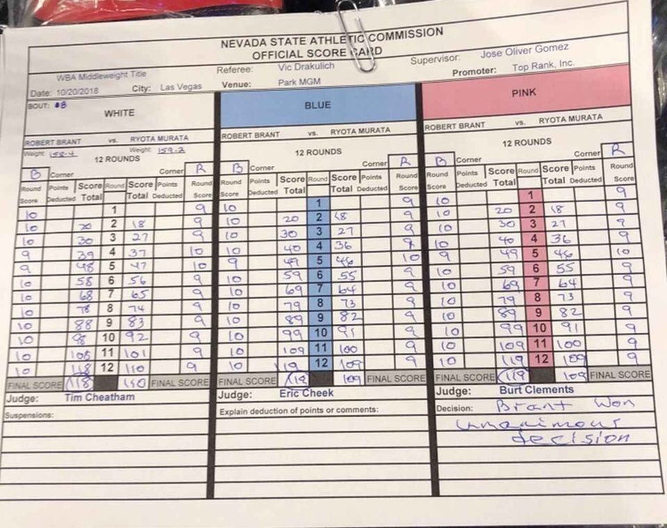 ネバダ州の三者によるスコアは、119対109が二人、118対110が一人と大差がついた。村田が明白に取ったラウンドは第5ラウンドひとつだった。