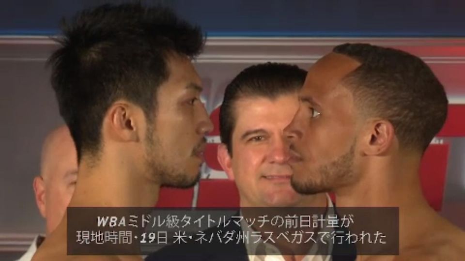 20日(日本時間21日)にアメリカ・ネバダ州ラスベガスで行われるWBA世界ミドル級タイトルマッチの前日計量で、チャンピオン村田諒太(帝拳)は159.2ポンド、挑戦者ロブ・ブラント(アメリカ)は158.4ポンドと、ともにリミットを下回るウェイトで一発パスした。計量後は壇上で互いに鋭い視線を交わし、決戦ムードを高めた。