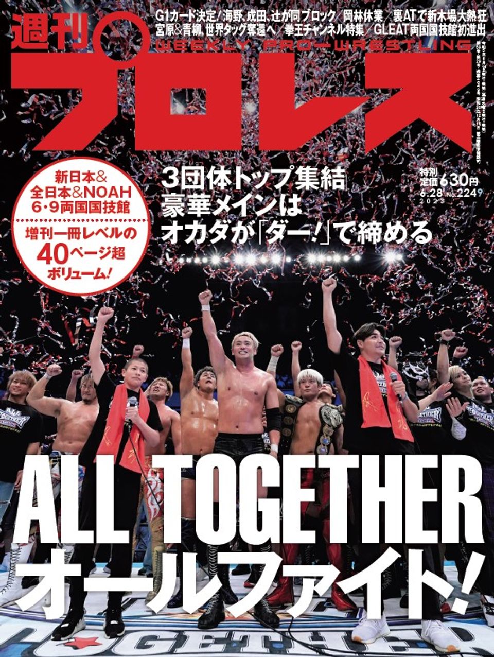 毎週水曜発売(一部地域はことなります)の週刊プロレスの内容、見どころを発売1日前の火曜に紹介します。 今週号の表紙は11年ぶりに開催された「ALL TOGETHER」のメイン後、オカダがダー!で締めたあとの出場選手集合写真です。新日本&全日本&NOAHの3団体が集結して、プロレス界としてコロナからの復興をアピールした大会。増刊号1冊分とほぼ同じ40ページ超ボリュームでリポートします。