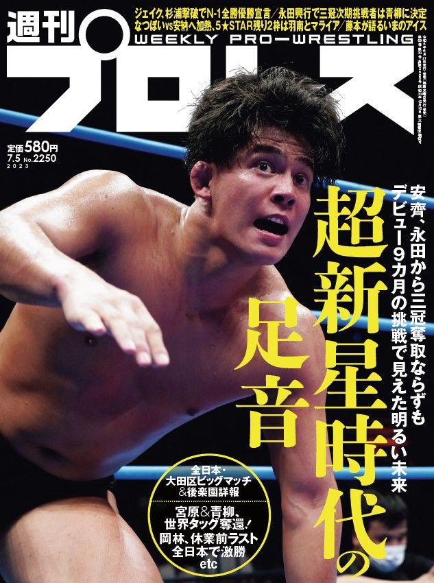 今週号の掲載内容は…安齊勇馬、永田裕志から三冠奪取ならずもデビュー9カ月の挑戦で見えた明るい未来。宮原健斗&青柳優馬、世界タッグ奪還! 全日本・大田区ビッグマッチ&後楽園詳報/ジェイク・リー、杉浦貴撃破でN-1全勝優勝宣言/永田興行で三冠次期挑戦者は青柳に決定/なつぽいvs安納サオリへ加熱、5★STAR残り2枠は羽南とマライア・メイ/藤本つかさが語るいまのアイス、ほか。