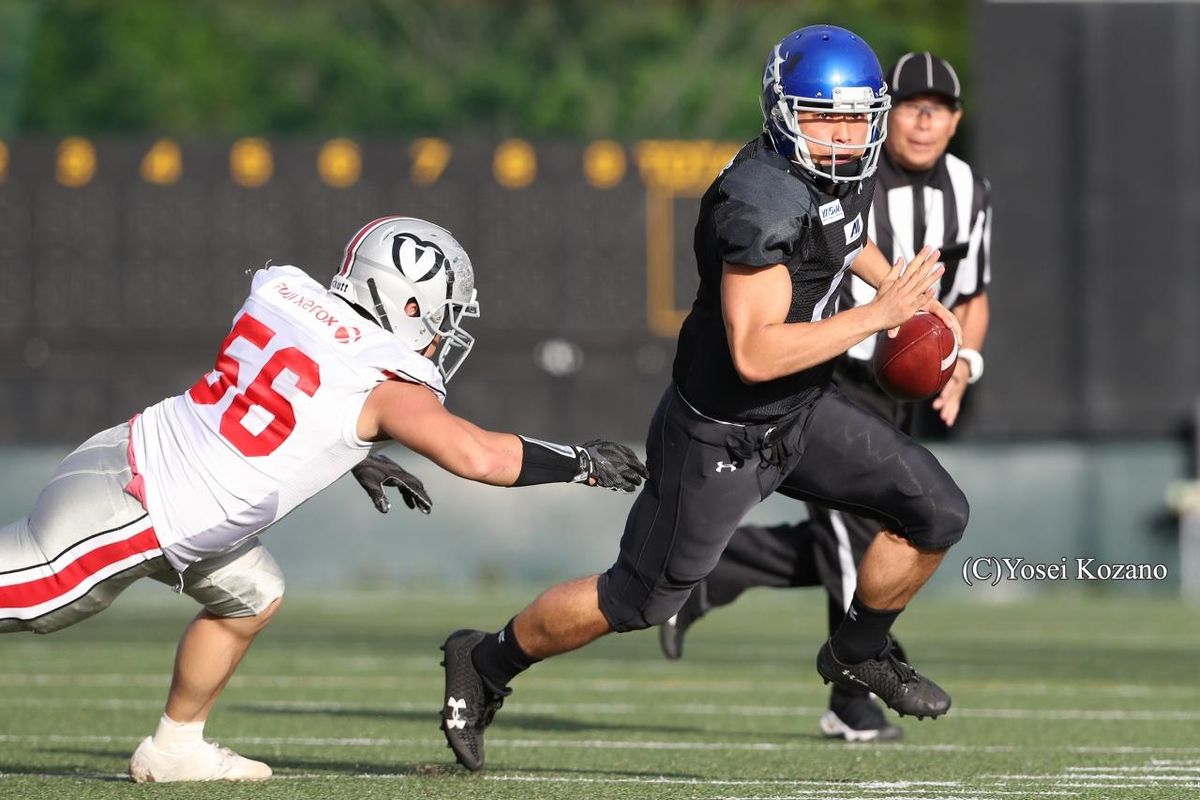 【IBM vs 富士ゼロックス】第2クオーター、パスを狙うIBMのQB政本。パス279ヤード3TDとオフェンスをリードした=撮影:Yosei Kozano