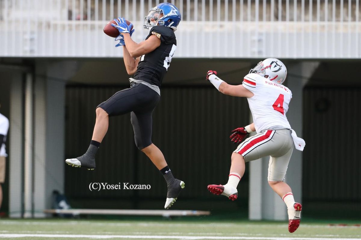 【IBM vs 富士ゼロックス】第2クオーター11分、IBMのQB政本からのロングパスをキャッチし、45ヤードのロングゲインとしたWR近江=撮影:Yosei Kozano