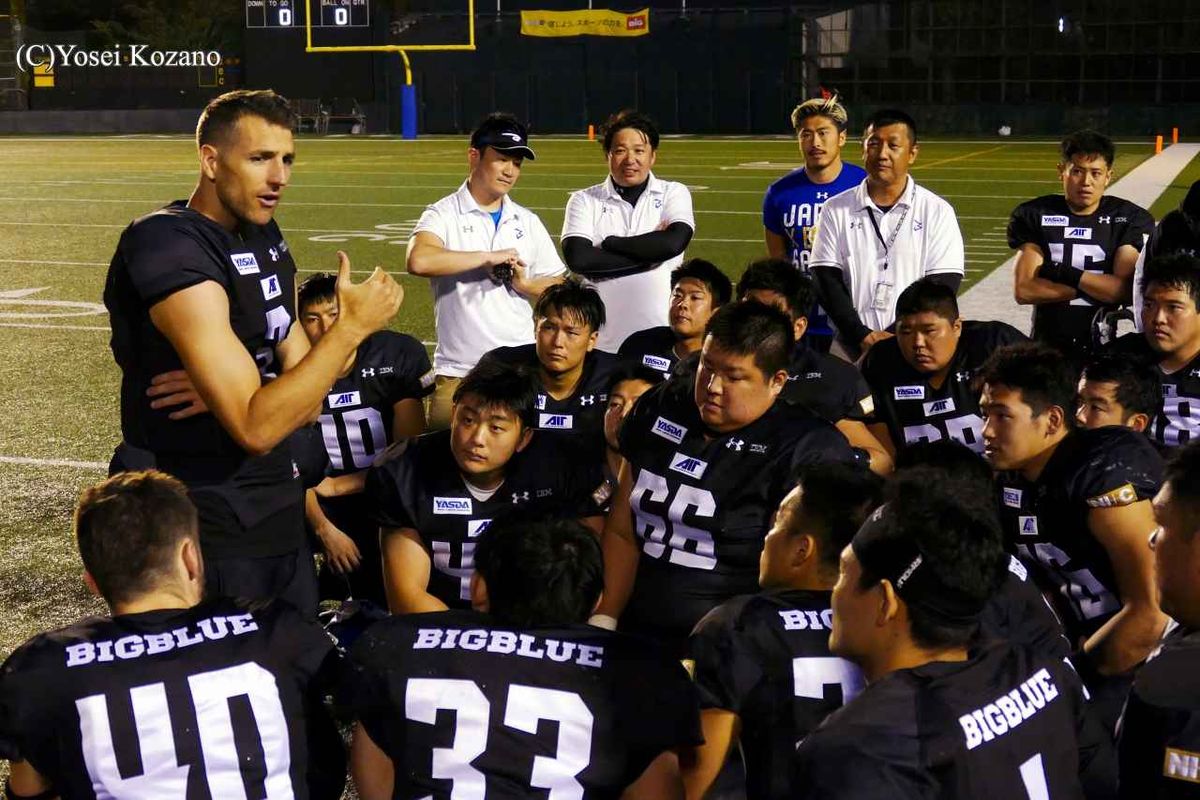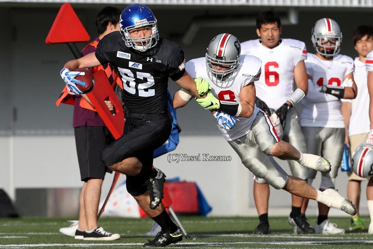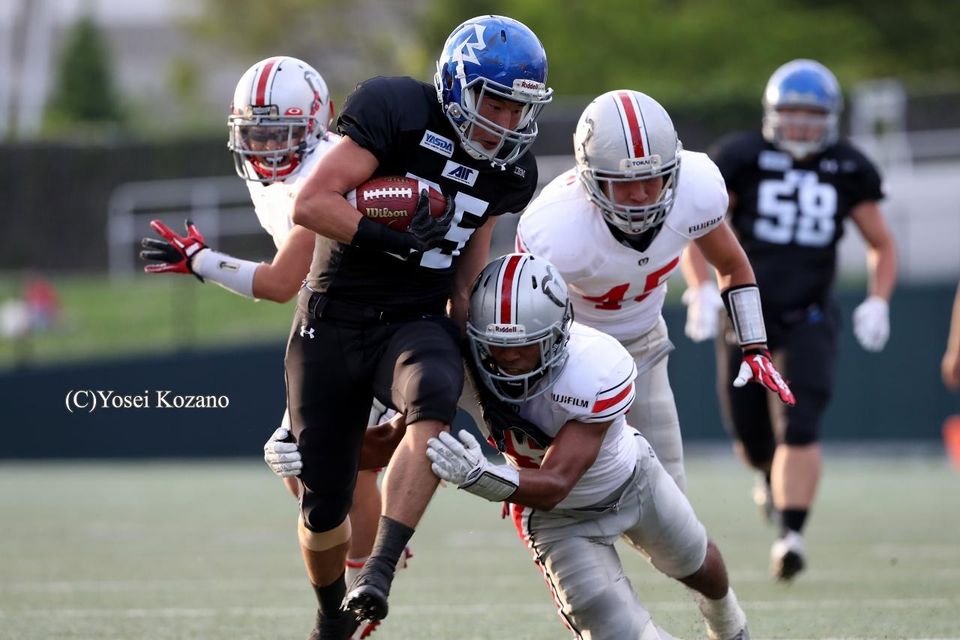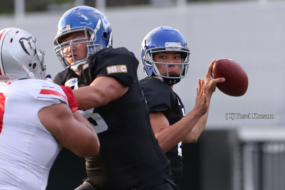 今季、山田晋三体制から、ケビン・クラフト新HCに引き継がれたIBM。さクラフトがQBとオフェンスコーディネーターを兼ねる中で、負担軽減のためには、もう一人のエースQB政本の活躍が、欠かせない。この日はクラフトの出番はなく、フィールド内の指揮は政本に委ねられた。結果的には快勝だが、課題は見え隠れする。第1クオーターの2度のオフェンスシリーズでは、いずれもテンポよく攻めてエンドゾーンを目の前にしながら、FG失敗とフォースダウンギャンブル失敗に終わった。政本も「パスのボールが浮いていた。スタートダッシュを切れなかったのは反省」という。第2クオーターに自らのランTDで流れをつかむと、そこからスタントン、鈴木とTDパスを重ねた。
