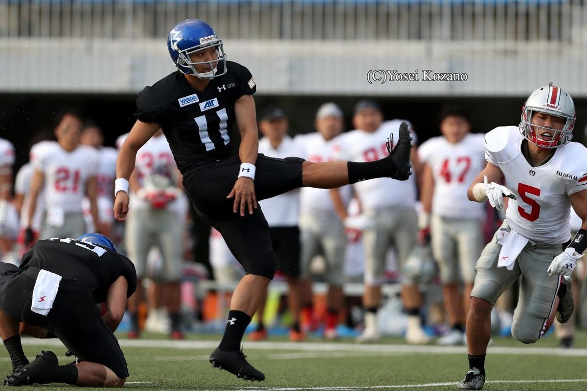 【IBM vs 富士ゼロックス】第2クオーター終了と同時に41ヤードのFGを決めたIBMのK佐藤=撮影:Yosei Kozano
