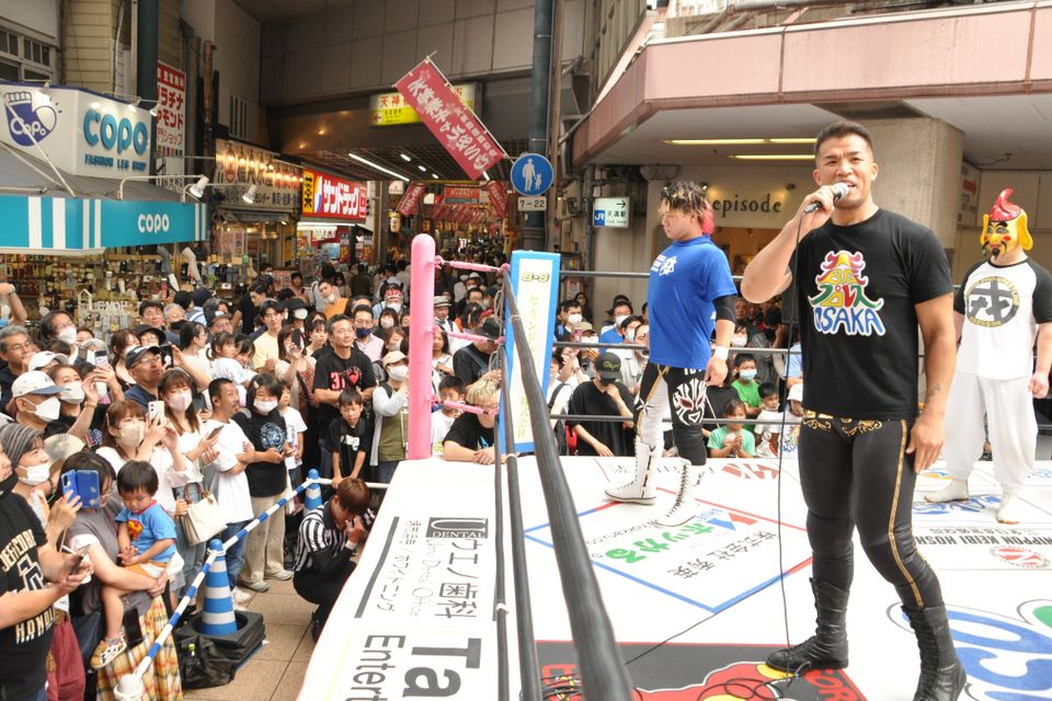 「今回の天神橋筋のこの大会は、去年に引き続き開催できたってことが大きくて、毎年この時期になると“天神橋筋4番街で大阪プロレスやってるんや”っていう具合に定番のイベントになればいいなと思ってます。それがいろんな場所に広がっていけば。2月はワンワールドフェスティバル、3月はキューズモール、4月は大阪城公園……っていうふうに、その場所での季節の風物詩にしていきたいですね」