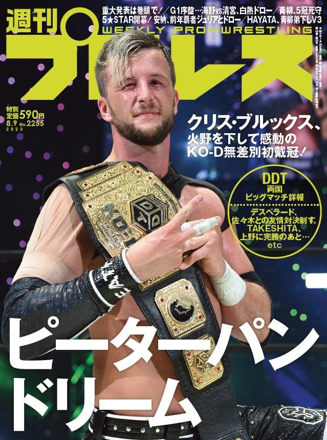 今週号の掲載内容は…クリス・ブルックス、火野裕士を下して感動のKO-D無差別級初戴冠! エル・デスペラード、佐々木大輔との友情対決制す。TAKESHITA、上野勇希に完勝のあと…DDT両国ビッグマッチ詳報/重大発表は巻頭で!/G1序盤…海野翔太vs清宮海斗、白熱ドロー/青柳優馬、5冠死守/5★STAR開幕!安納サオリ、前年覇者ジュリアとドロー/HAYATA、青柳亮生下しV3、ほか。