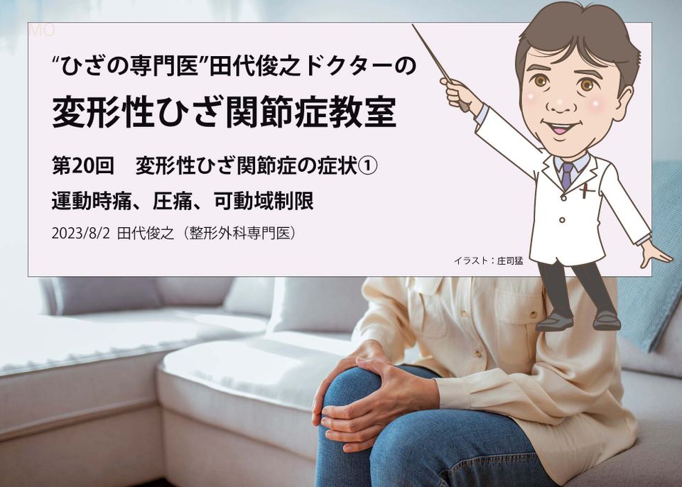 ひざは健康寿命延伸の要の関節。ところが、中高年になると、ひざ関節の軟骨がすり減り、「ひざが痛い」「水がたまる」「痛くて長く歩けない」「ひざか変形した」などといった症状に悩む方が増えてきます。本連載では、ひざの専門医・田代俊之ドクターが、変形性ひざ関節症について、やさしく解説していきます。今回から2回にわたり、変形性ひざ関節症の症状を詳しく説明していきます。