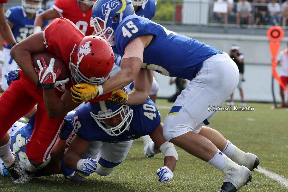 【関学大 vs 日大】日大のフォースダウンギャンブルでRB宋のランを止める関学大DB西原=撮影:Yosei Kozano