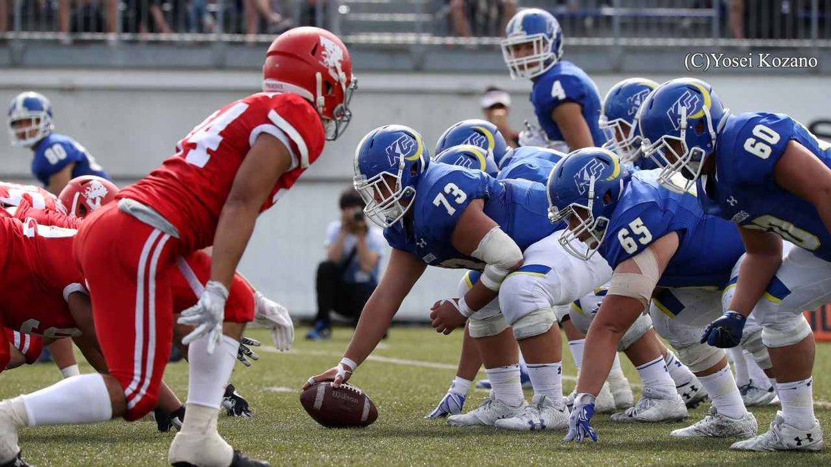 【関学大 vs 日大】日大の大きく強いDLに苦戦した関学大のOL=撮影:Yosei Kozano