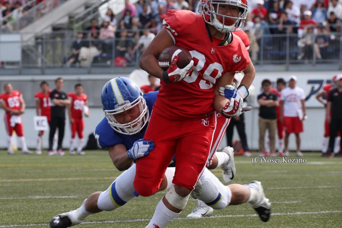 序盤でリードした関学大が日大の反撃を抑えて逃げ切った。関学大は第1クオーター5分にRB山口祐介のランで先制タッチダウン(TD)。6分にはQB西野航輝からTE對馬隆太に46ヤードTDパスが決まった。関学大は第2クオーターにも山口が90ヤードを快走してTDを奪い、リードを広げた。追う日大は同5分、関学大のキッキングミスから生まれたチャンスで、QB室井正道がWR林裕嗣にTDパスを決めた。後半は両校ともに無得点が続いたが、日大は第4クオーター残り11秒でQB沼田将吾からWR小倉豪にパスでTD。しかし、直後のオンサイドキックを関学大に抑えられ、決着となった。
