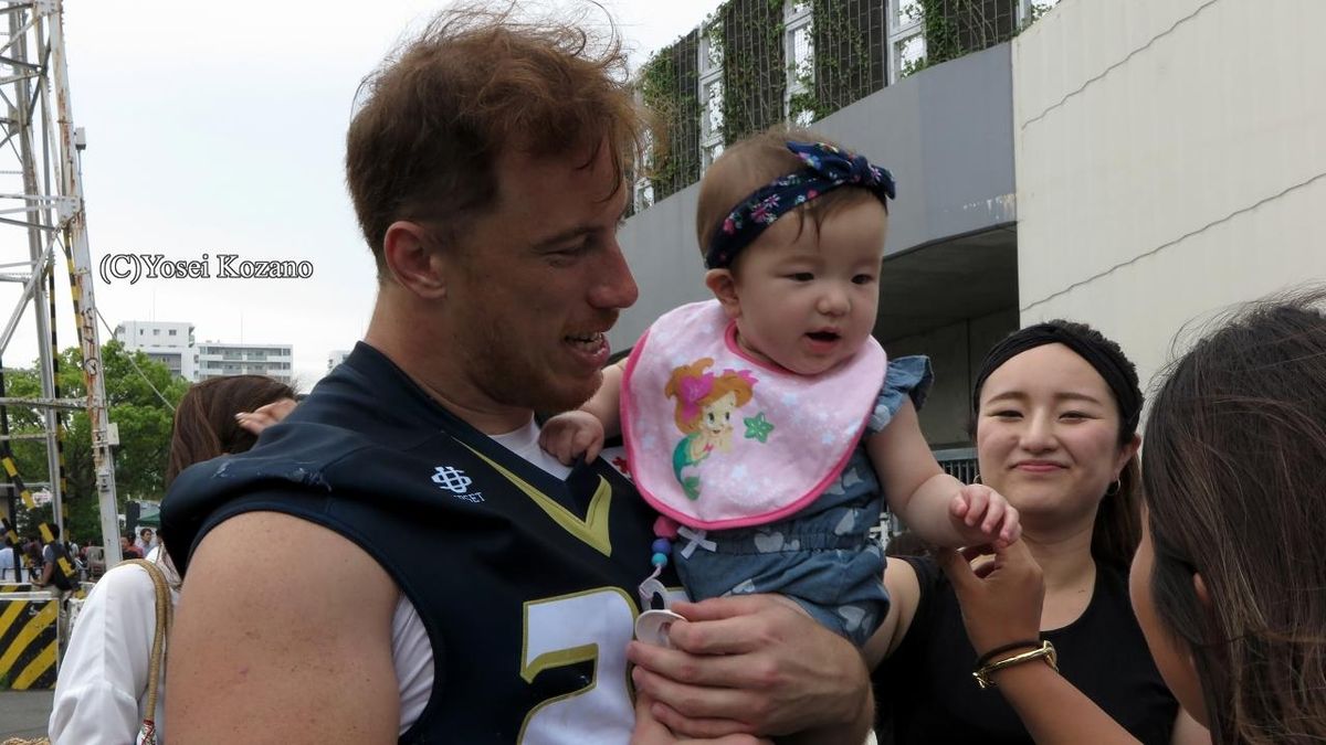 【オービック vs 明治安田】試合終了後、愛娘を抱いてファンと交流するオービックのDLバイロン・ビーティージュニア