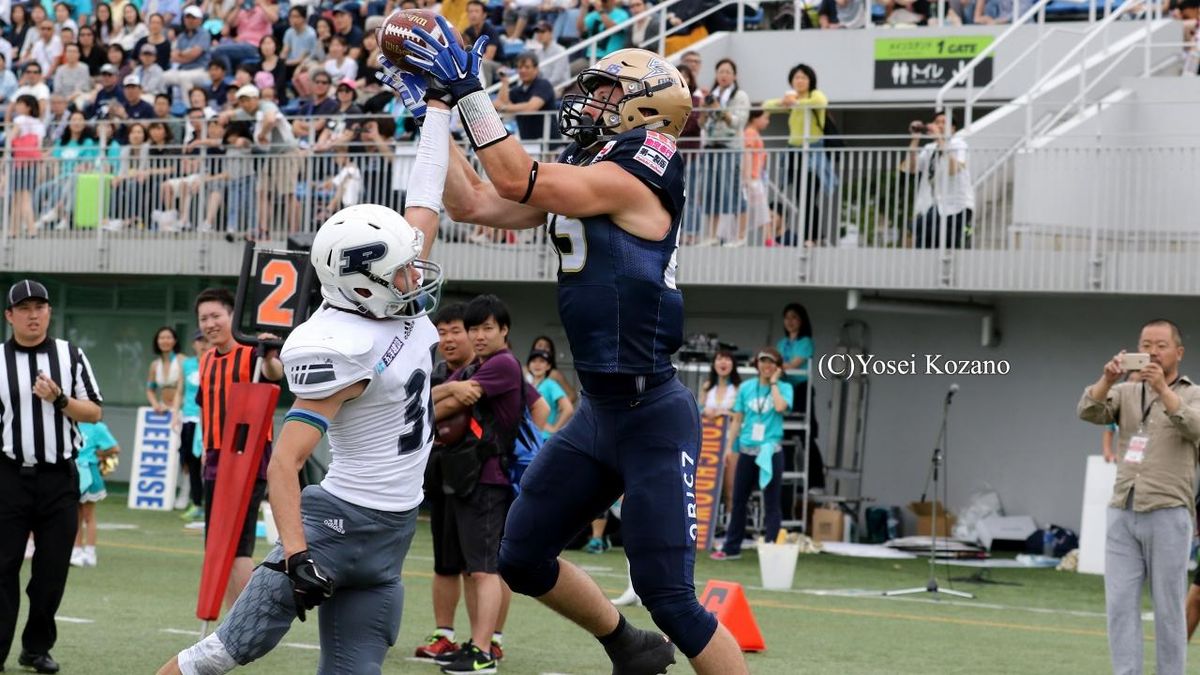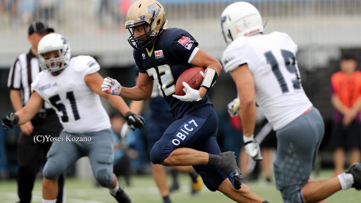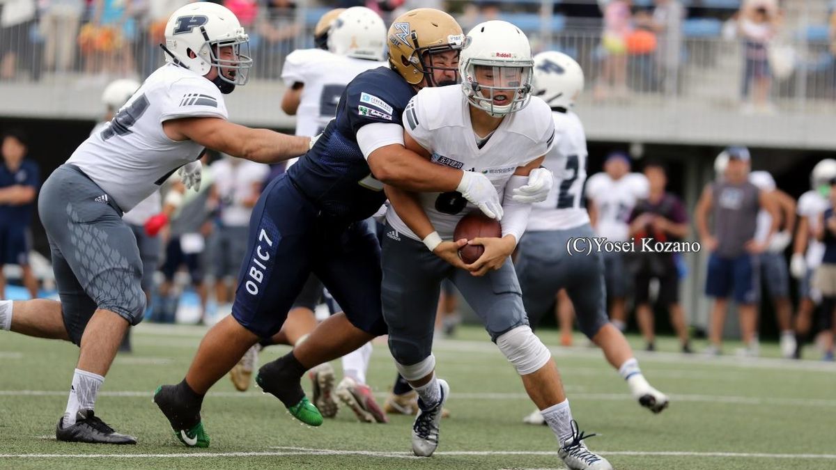 オービックが、新QBスカイラー・ハワードの活躍で、明治安田に快勝した。オービックは第1クオーター9分、QBハワードから同じく新加入のTEホールデン・ハフに先制のタッチダウン(TD)パス。第2クオーターにはエースWR木下典明に36ヤードのロングパスでTDを奪った。その後も、日大から加入の新人DBブロンソン・ビーティーのインターセプトで得たチャンスをTDに結び付けるなど着々と得点を重ね。試合を決めた。オービックはディフェンス陣も、タックルフォーロスを連発して明治安田のランをマイナス42ヤードとするなど、シーガルズらしさを見せた。QBハワードの成績はパス7/12回、134ヤード、3TD1インターセプト、ラン7回69ヤードだった
