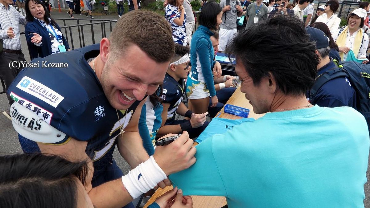 【オービック vs 明治安田】試合終了後のサイン会で笑顔を見せる、オービックの新QBスカイラー・ハワード