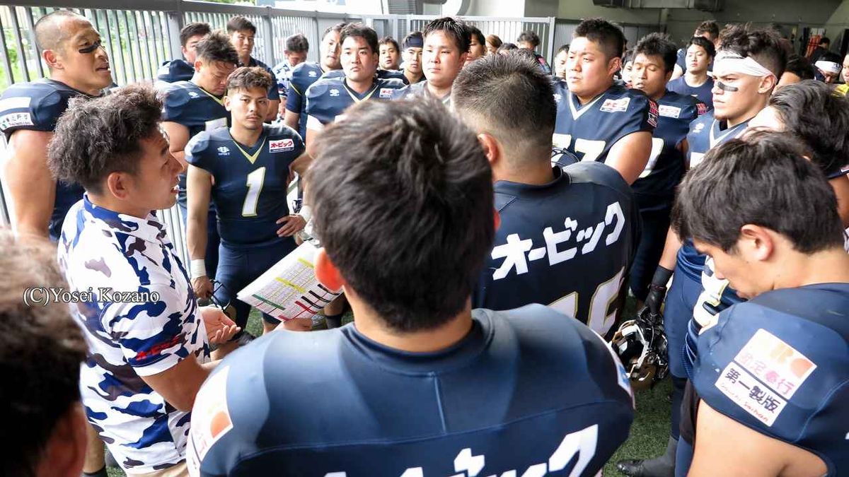終わってみれば、オービックの圧勝劇。しかし序盤はちぐはぐな部分が目立った。明治安田の冒頭のオフェンスでは立て続けに2回ファーストダウンを許して26ヤードを進まれた。QBスカイラー率いるオフェンスも、ファーストシリーズはTDに結び付けたが、2回目のドライブではエンドゾーン内でパスをインターセプトされた。