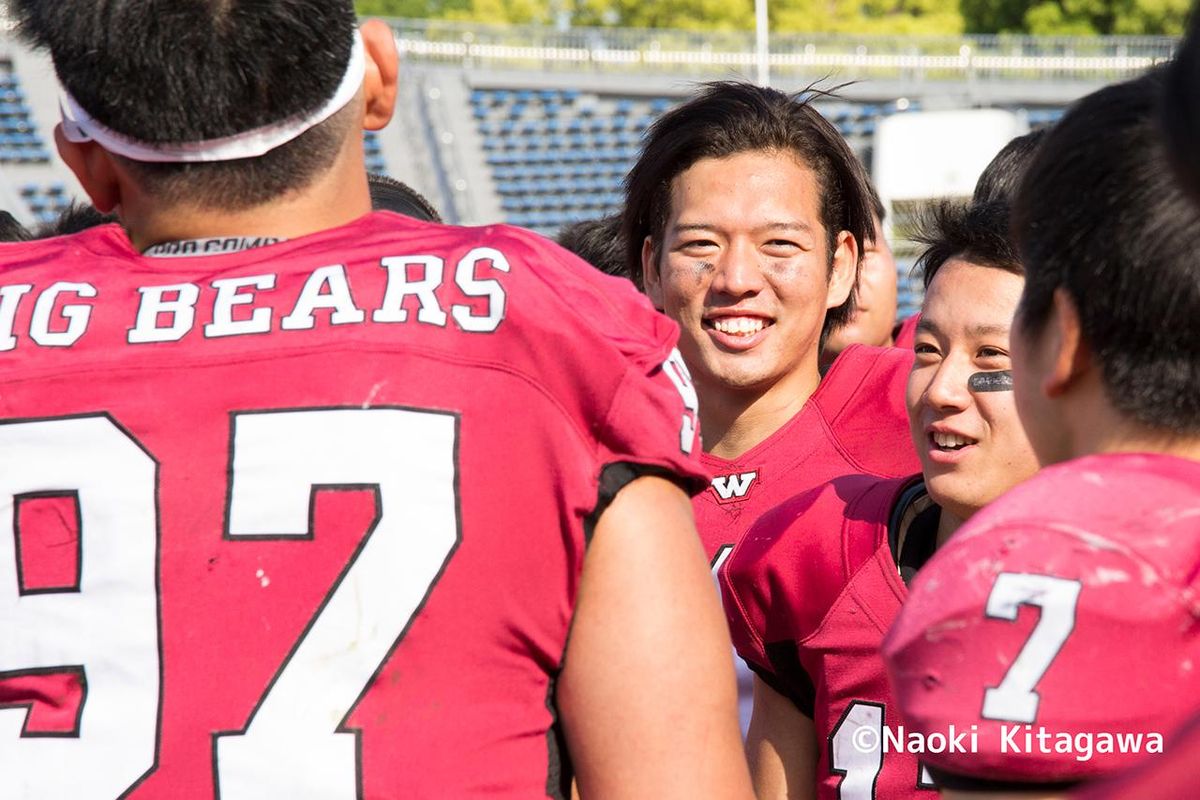 アメリカンフットボールの第66回早慶戦は、4月29日、初夏を思わせる日差しの駒沢陸上競技場で行われ、早稲田大学が快勝した。試合後、早稲田のサイドラインの端でQB#1柴崎哲平が清々しい笑顔を見せていた。