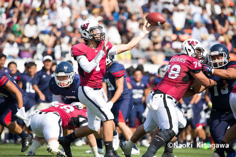 慶應義塾ディフェンスのプレッシャーをかわしながらパスを投じる早稲田QB#1柴崎哲平