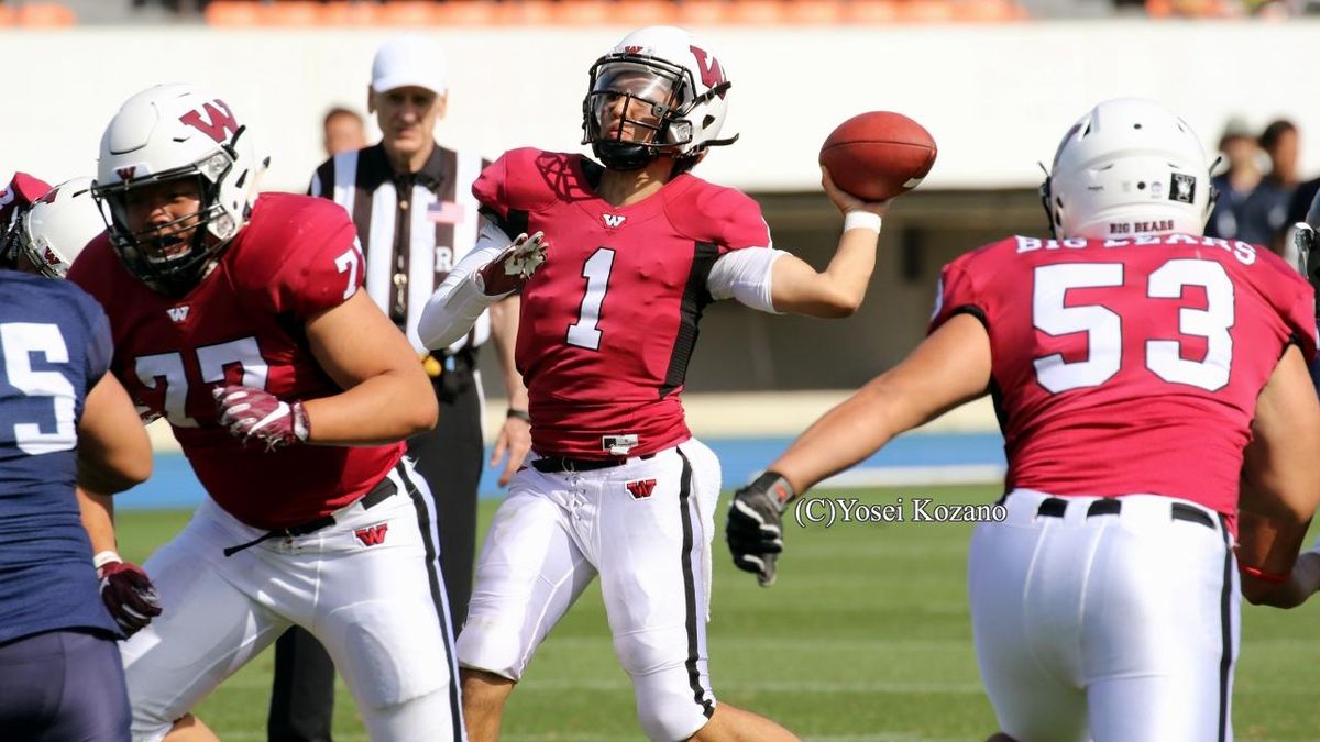 【早大vs慶大】第4クオーター、TDパスを決める早大QB柴崎。大学日本代表にも選ばれた好パサーはパスで2TDを記録した