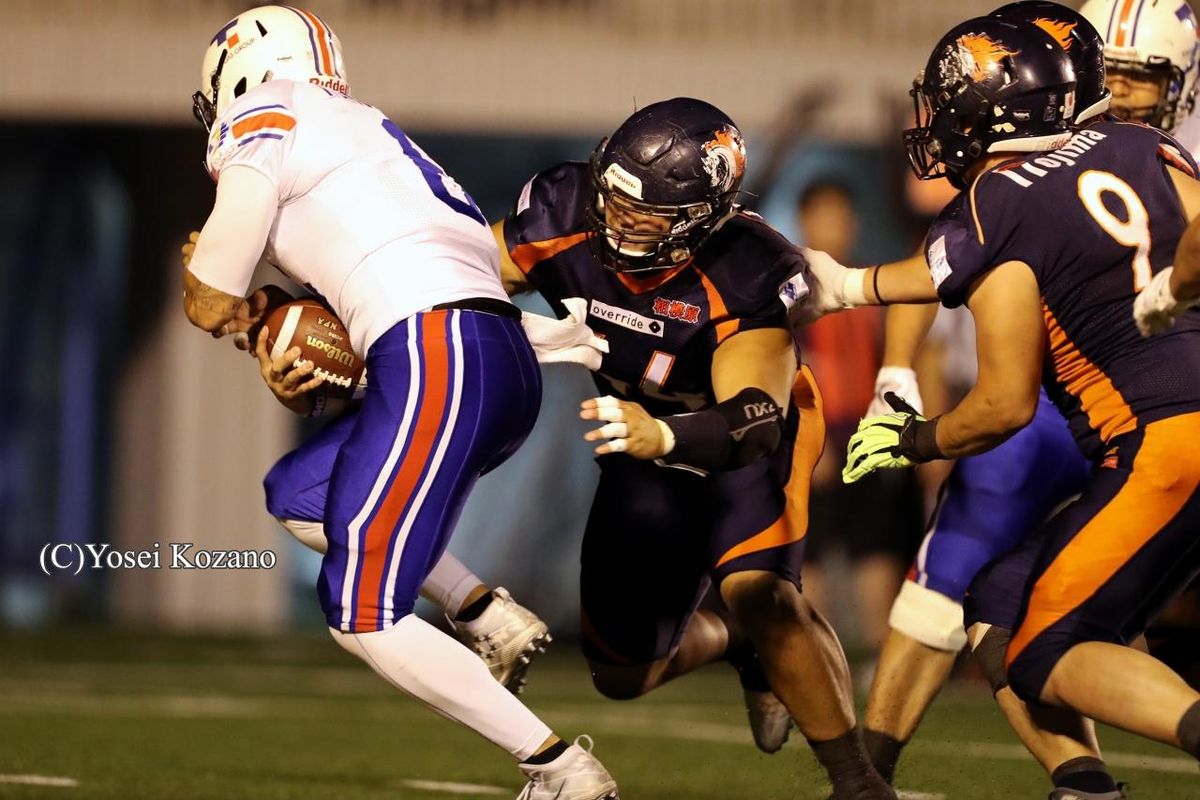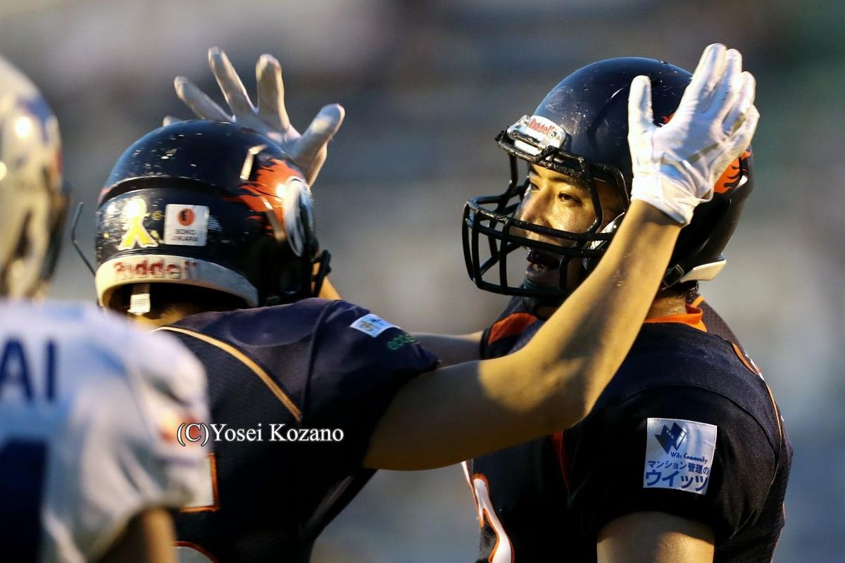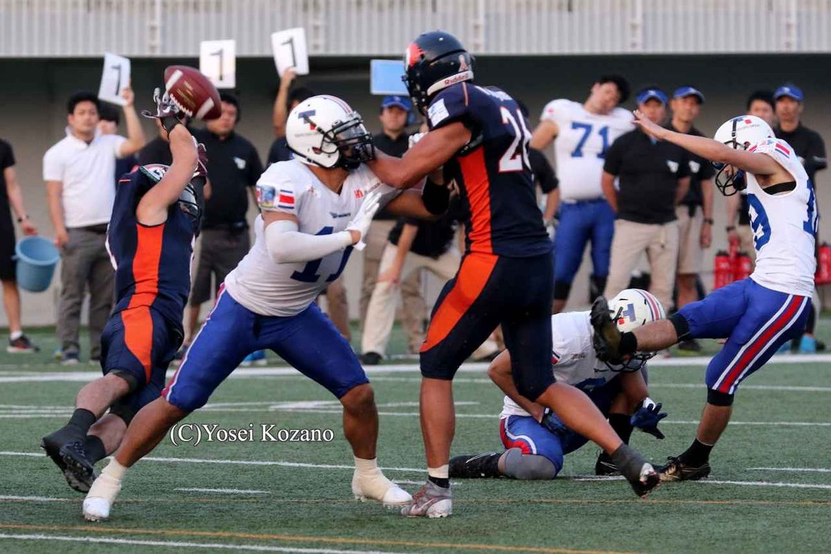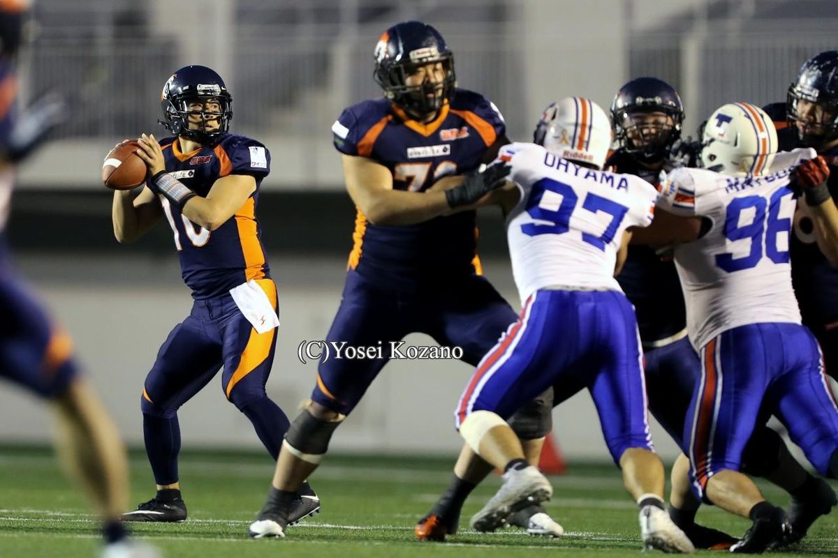 ディフェンスの踏ん張りに応えたのが、「スターターは大学時代以来」(須永恭通ヘッドコーチ)だったQB藤本だ。試合序盤で宮幸崇、東松瑛介という主戦RB2人が負傷で退く状況の中、落ち着いたクオーターバッキングで、オフェンスをリードした。前半はショートパス主体で組み立て、後半はエースレシーバー八木へのパスを中心に、タテを意識したオフェンスが奏功した。藤本のパス成績は24/40、281ヤード4TD(1インターセプト)と、しっかり務めを果たした。そんな藤本を須永HCは「ある程度気持ちよくプレーができたとは思うが、まだまだQBとしてやらなければならないことができていない」とみる。ディフェンスのパフォーマンスにも「米国人QBはプレッシャーをかけないと守れない。それはよくわかっていたので、ある程度想定通りにできた」と話す。