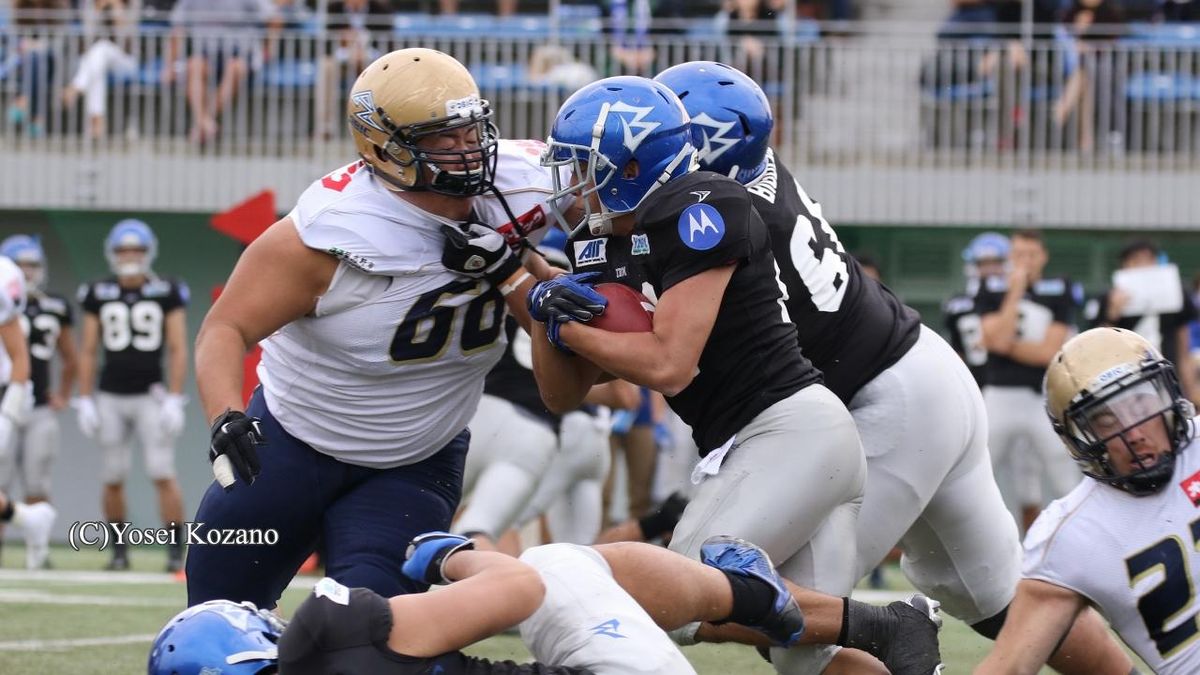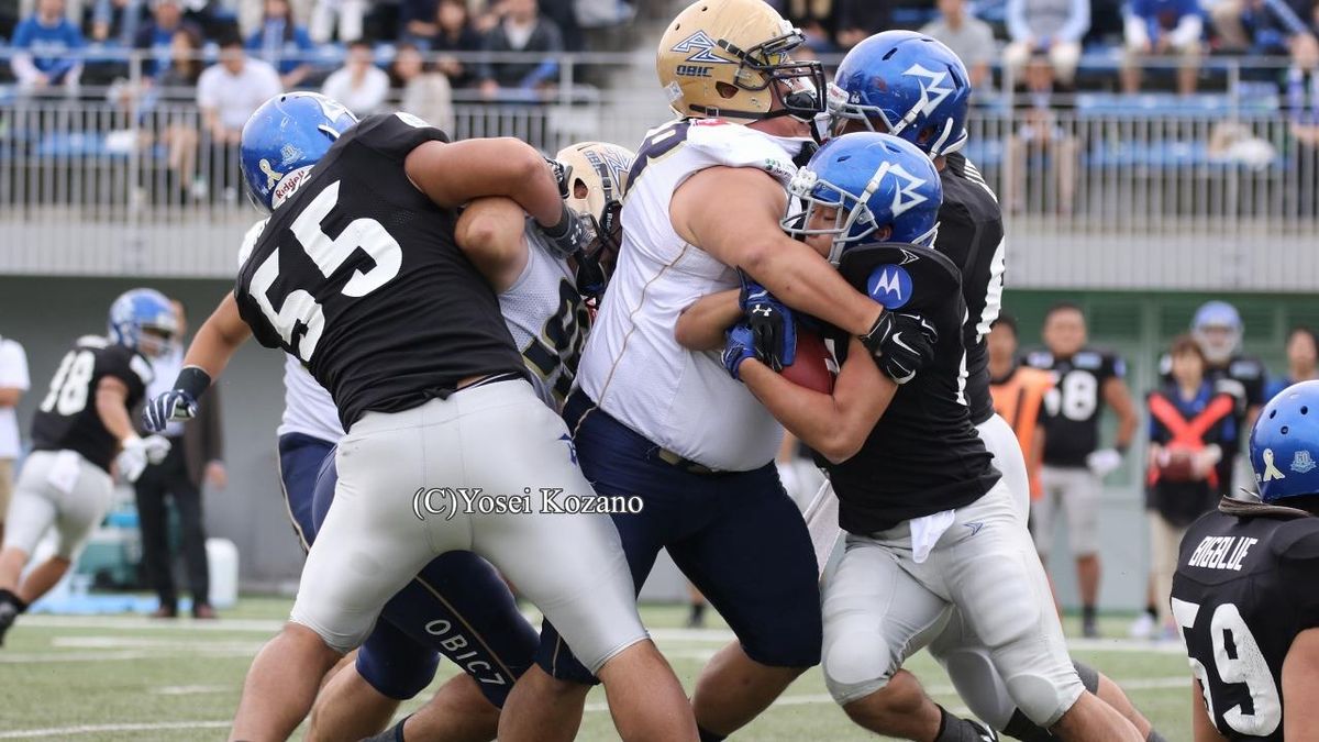 OLのブロックを片手で受け止めながら、ボールキャリアーをタックルする清家