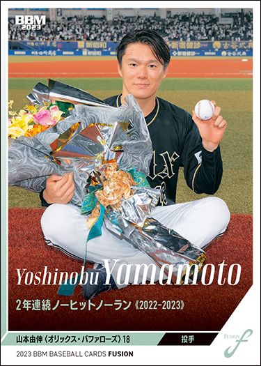 2年連続ノーヒットノーランは長いプロ野球史の中でも戦前の沢村栄治投手、亀田忠投手以来3人目。82年前の記録まで遡らなければならない程の大偉業を成し遂げた山本投手の凄さを、裏面コメントからも改めて感じ取る事が出来る1枚です