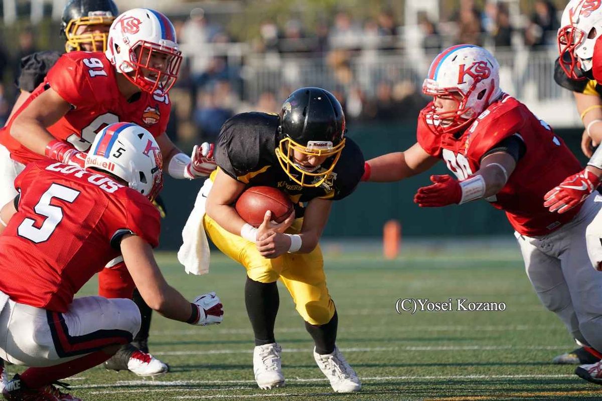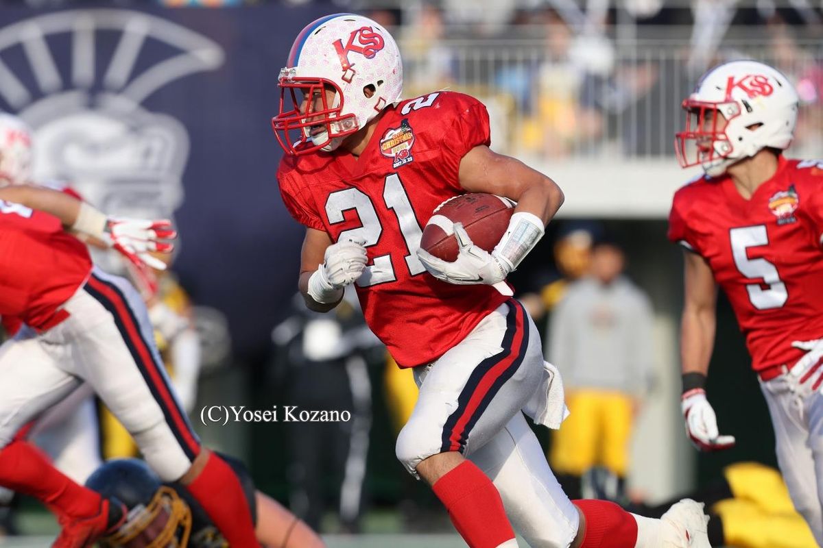 第3クオーター、佼成はパントリターンでリターナーのDB北川太陽が関大一にタックルされながらLB比留間豊にバックトス。比留間がサイドライン際を駆け上がって75ヤードのリターンTDとした。関大一は後半に入ってランが出るようになり、佼成ゴール前まで攻め込んだが、またもTDを奪えずフィールドゴール(FG)に。直後のオフェンスシリーズで佼成はQB野沢がパスをリズムよく決めて攻め込むと、大島にTDパスをヒットして29-10と突き放した。関大一は、第4クオーター冒頭にRB柳井竜太郎のランでTDを奪って13点差まで詰め寄ったが、佼成は試合最終盤のオフェンスシリーズで、フォースダウンギャンブルからファーストダウンを奪って試合を決めた。