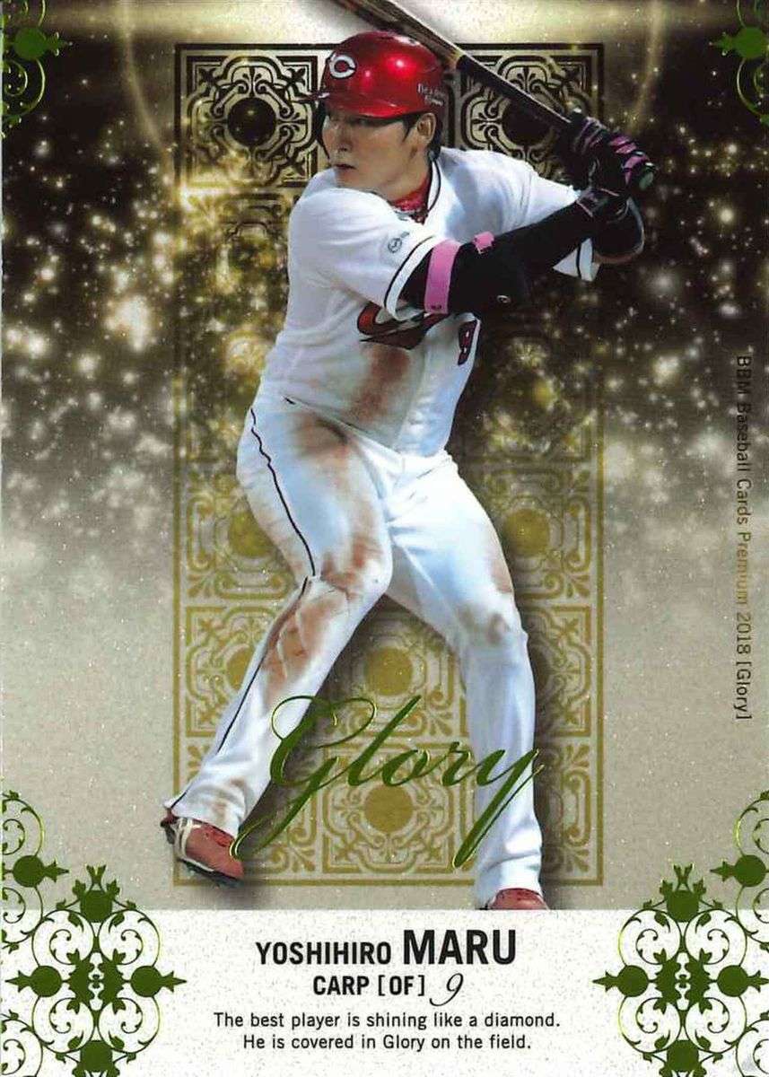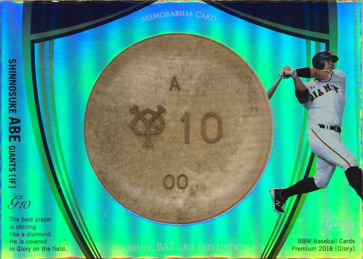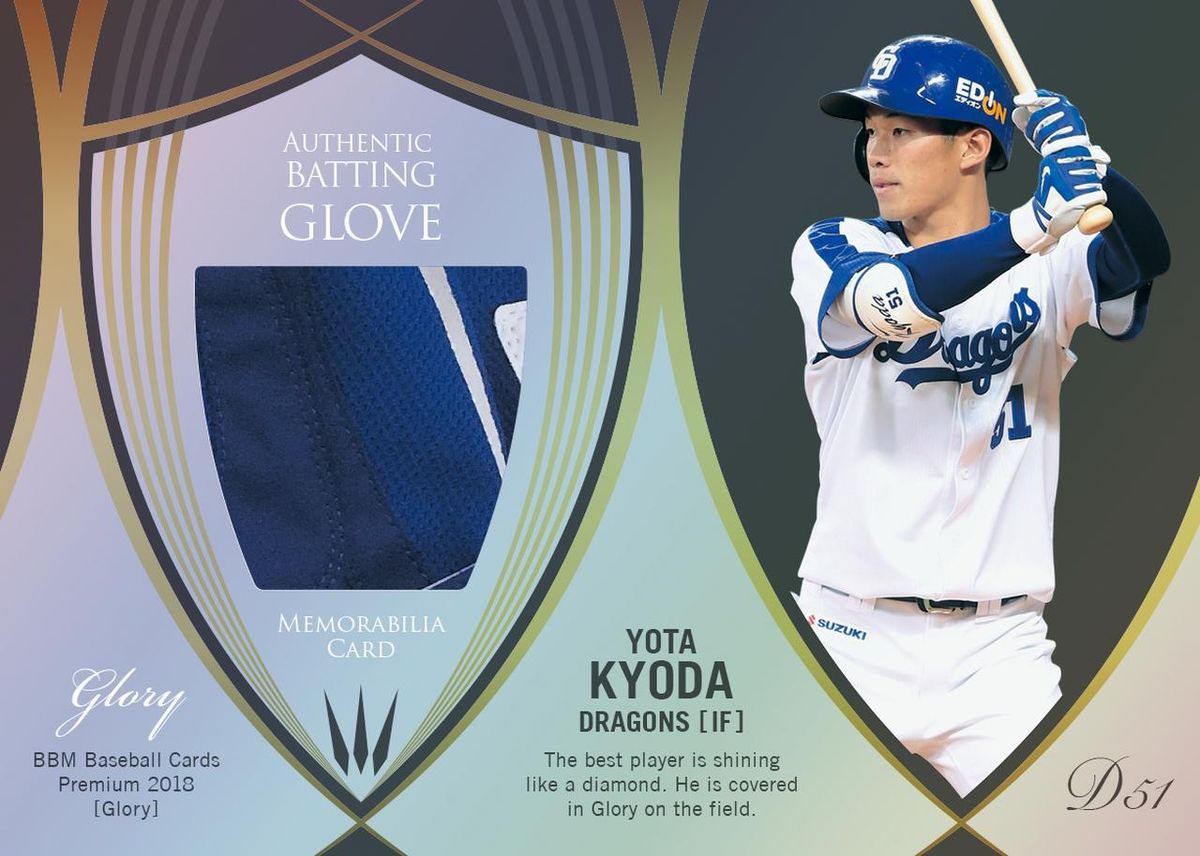 メモラビリアカードには通常版からホロ加工を採用し、高級感を演出しました。ソフトバンク・柳田、楽天・松井裕、オリックス・黒木、日本ハム・西川、ロッテ・福浦、広島・田中、阪神・糸原、DeNA・宮﨑、ヤクルト・山田のジャージーは各99枚、巨人・阿部のバットは88枚、中日・京田のバットが30枚となっています。ジャージーには各25枚のバッチ版、阿部のバットには10枚のバレル版もあります。