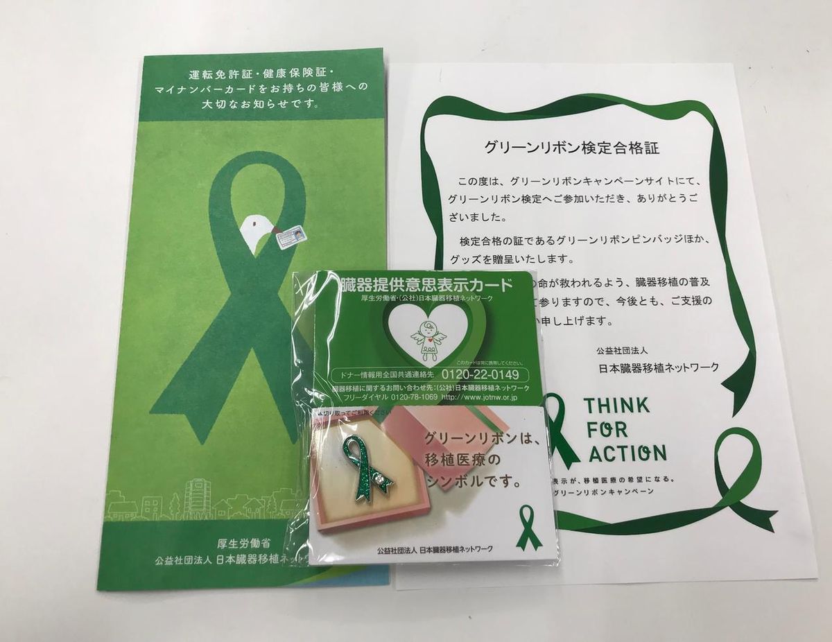 このサイトで「グリーンリボン検定」を行い、見事(?)合格。先日、臓器移植ネットワークから、合格証、グリーンリボンのピンバッジ、臓器提供意思表示カードが届きました。