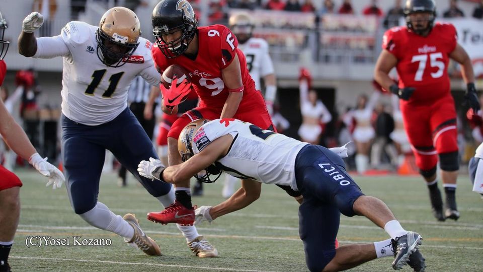 【富士通 vs オービック】第4クオーター残り42秒、オービックのQB菅原のパスをインターセプトし、勝利を決めた富士通のDBアディヤミ