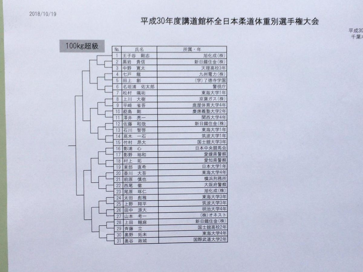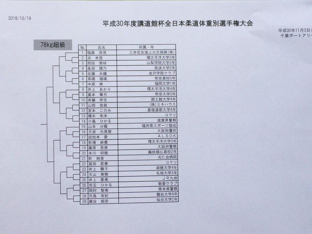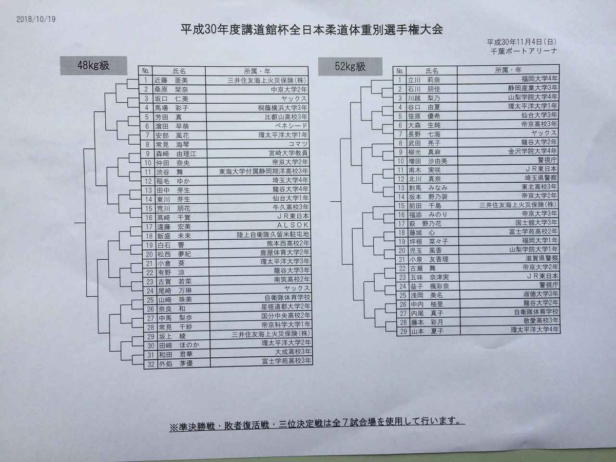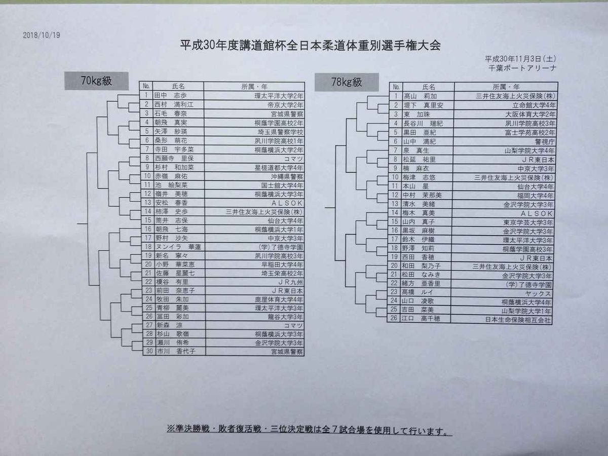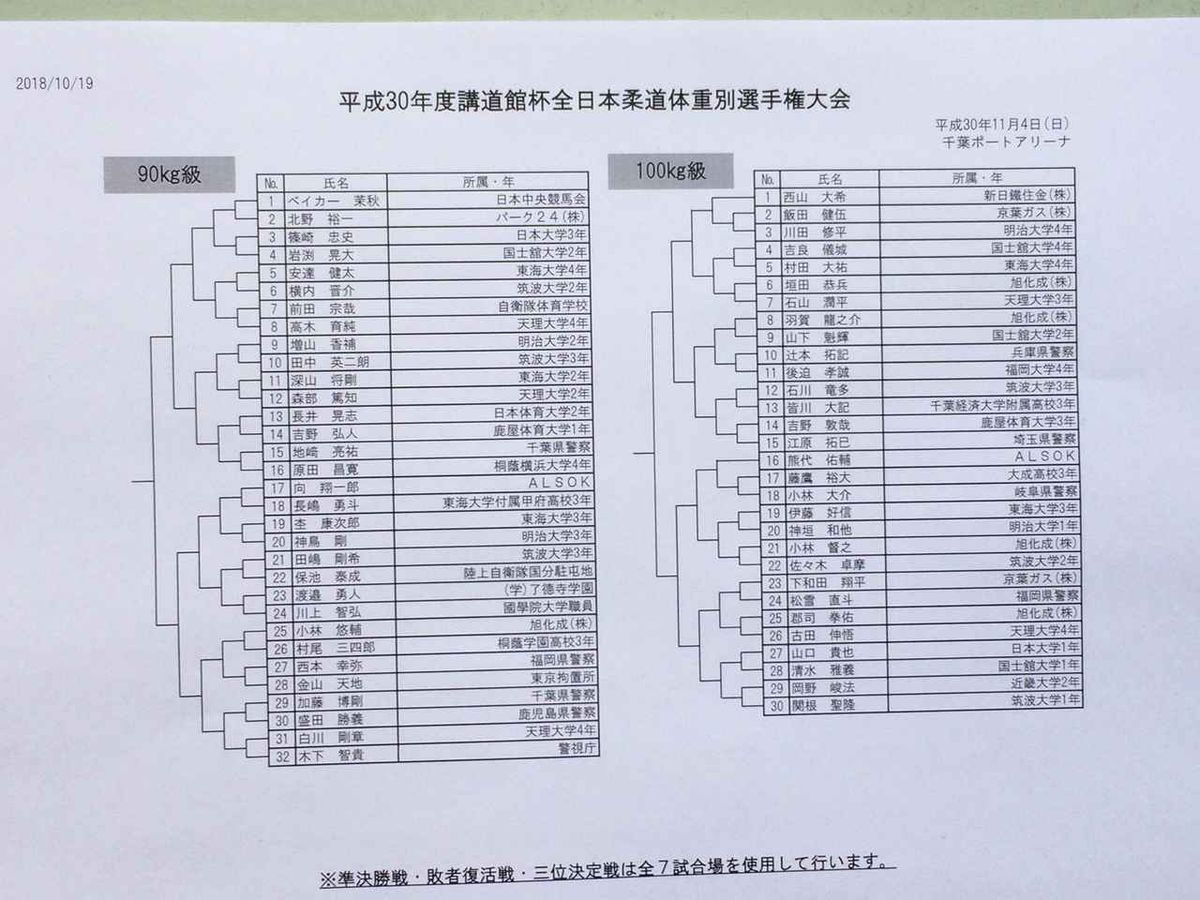 平成30年度講道館杯全日本柔道体重別選手権大会 組み合わせ