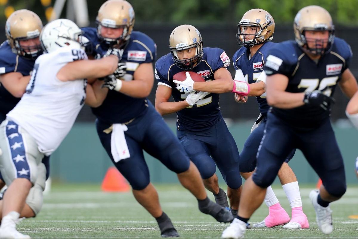【オービック vs アサヒビール】オービックのOL陣と、RB原。原は6回37ヤードと健在ぶりをしめした