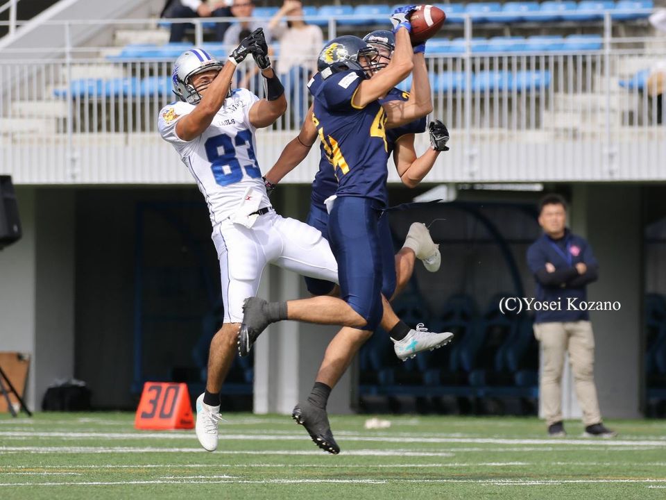 そんなチームを救ったのが、ディフェンスのビッグプレーだった。第4クオーター9分、3点差を追われる展開で、警視庁QB中山のパスをS(セーフティー)末富が値千金のインターセプトした。中山はゲーム中盤からパスの調子が上がっていたが、末富は「あの警視庁のオフェンスシリーズは、どこかで切らなければ、と(インターセプトを)狙っていた」という。ミドルを守っていて、警視庁のレシーバーが4枚出ていたが「QBがパッと見たレシーバーに投げた。その前にQBを見た時に『(自分が守っているサイドの)こっちに投げてくるかな』と思った。だからあまりフィールドの広い方に寄り過ぎず、タイミングよくレシーバーの前に入ることができた。気持ちよかった」と笑顔を見せた。