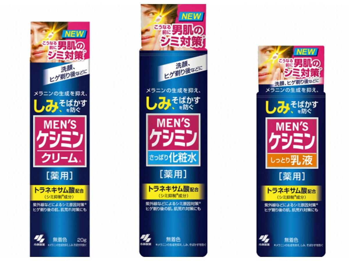 左から「メンズケシミン クリーム」、「メンズケシミン 化粧水」、「メンズケシミン 乳液」(各1200円+税)