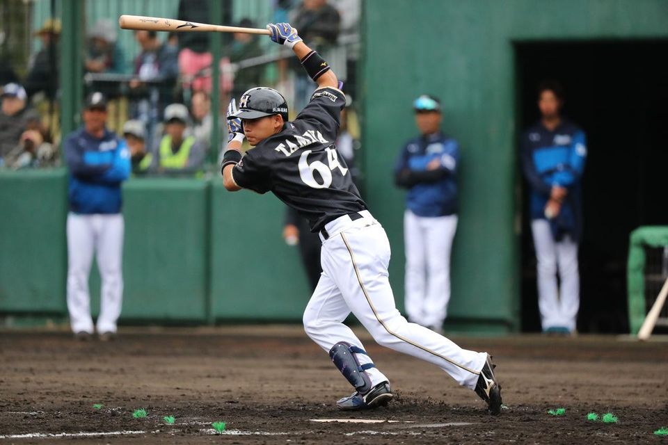 ※写真上=ルーキーの田宮裕涼は紅白戦で豪快な打撃フォームをみせる